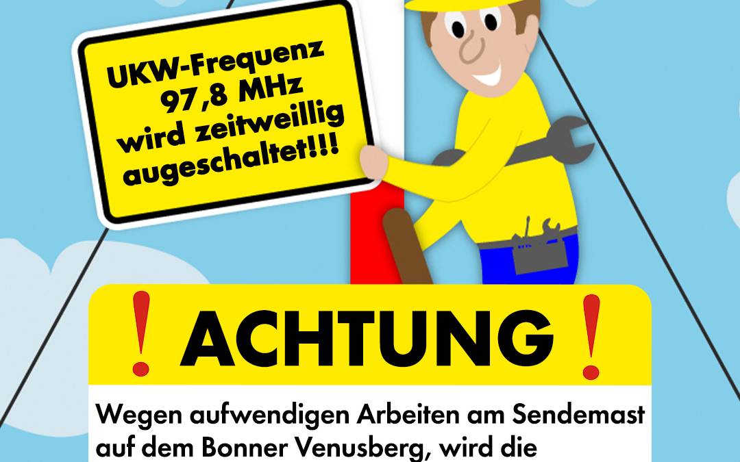 An unserem Sendemast auf dem Bonner Venusberg wird am Mittwoch und Donnerstag gearbeitet. Und das hat auch Folgen für unsere UKW-Frequenz 97,8. Das Signal wird am Mittwoch zweimal für jeweils drei Stunden abgeschaltet, Donnerstag dann nochmal für anderthalb Stunden.