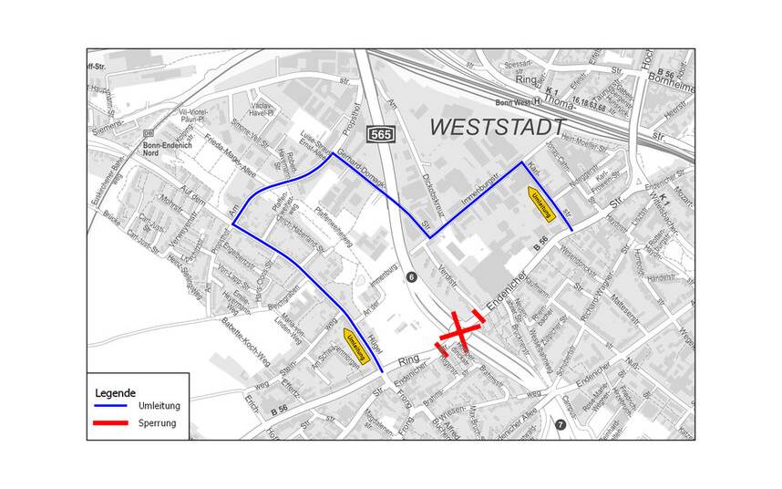 Für die Zeit der Sperrung hat die Stadt Bonn Umleitungen ausgeschildert. Die innerstädtische Umleitung zwischen Endenich und Weststadt/Innenstadt führt über die Straßen Auf dem Hügel, Am Propsthof, Gerhard-Domagk-Straße, Immenburgstraße und Karlstraße.