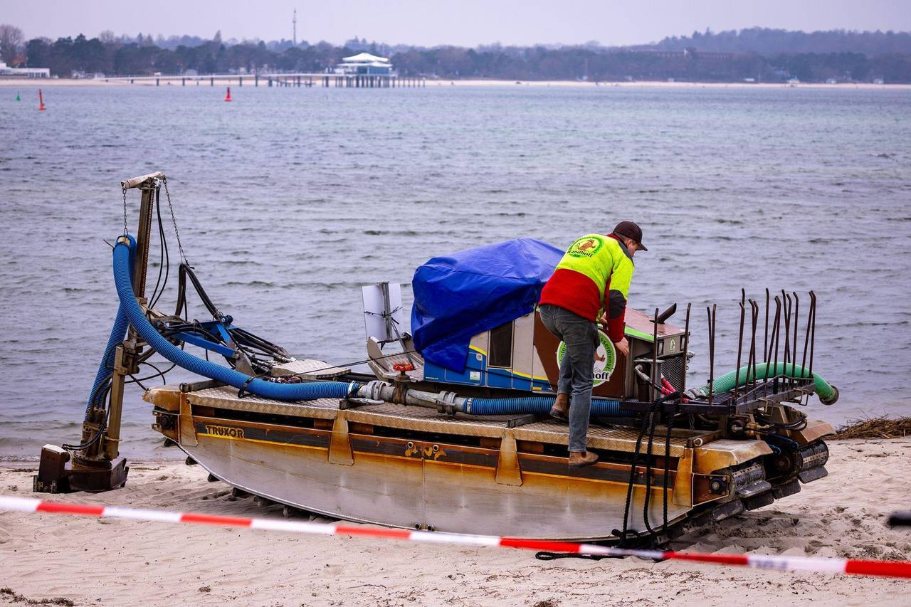 Timmendorfer Strand (dpa) - Experten versuchen erneut den vor Timmendorfer Strand festsitzenden Buckelwal freizubekommen. So haben zwei Bagger in einiger Entfernung von dem auf einer Sandbank festsitzenden Tier damit begonnen, eine Rinne zu graben. Ein dritter Bagger steht laut einem dpa-Reporter vor Ort noch zur Unterstützung am Strand bereit.