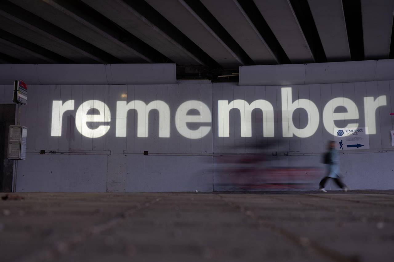 An Unterführung an der Metrostation Maalbeek, an der am 22. März 2016 einer der Terroranschlag stattfand, wird derzeit das englische Wort «remember» die Wand projiziert und damit zum Erinnern angeregt.© Markus Lenhardt/dpa