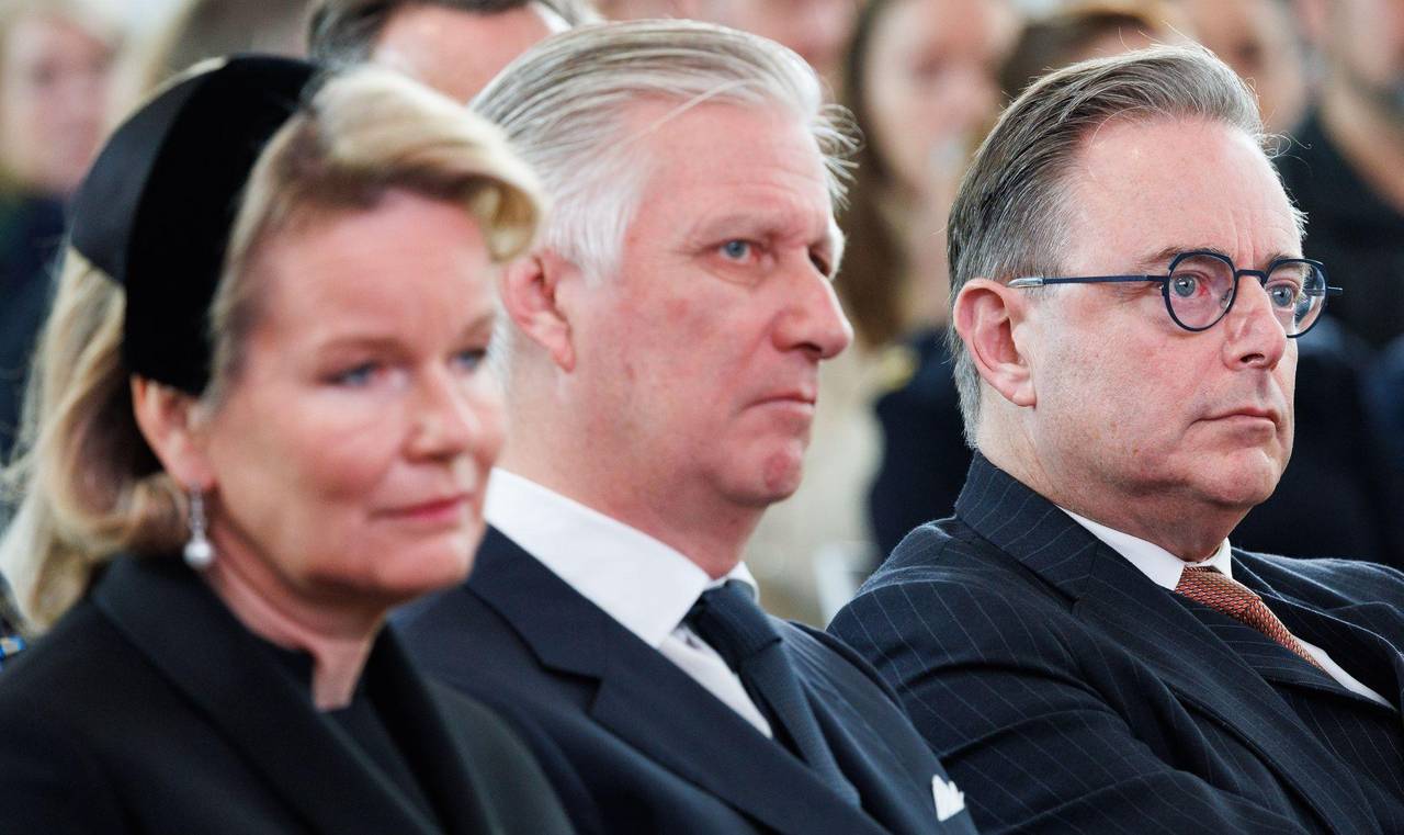 Regierungschef Bart De Wever (r) nahm gemeinsam mit Königin Mathilde und König Philippe an den Gedenkfeiern teil.© Benoit Doppagne/Belga/dpa
