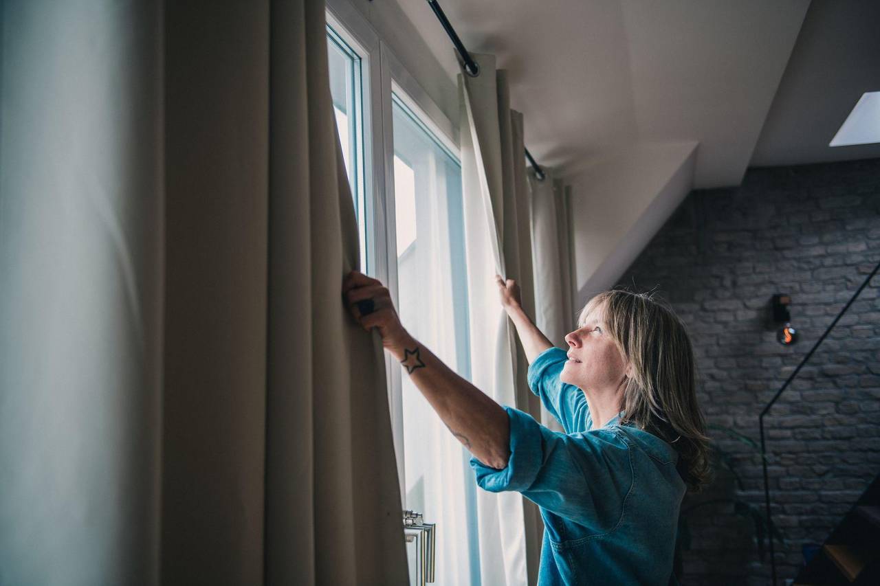 Eine Frau steht vor geöffneten Vorhängen