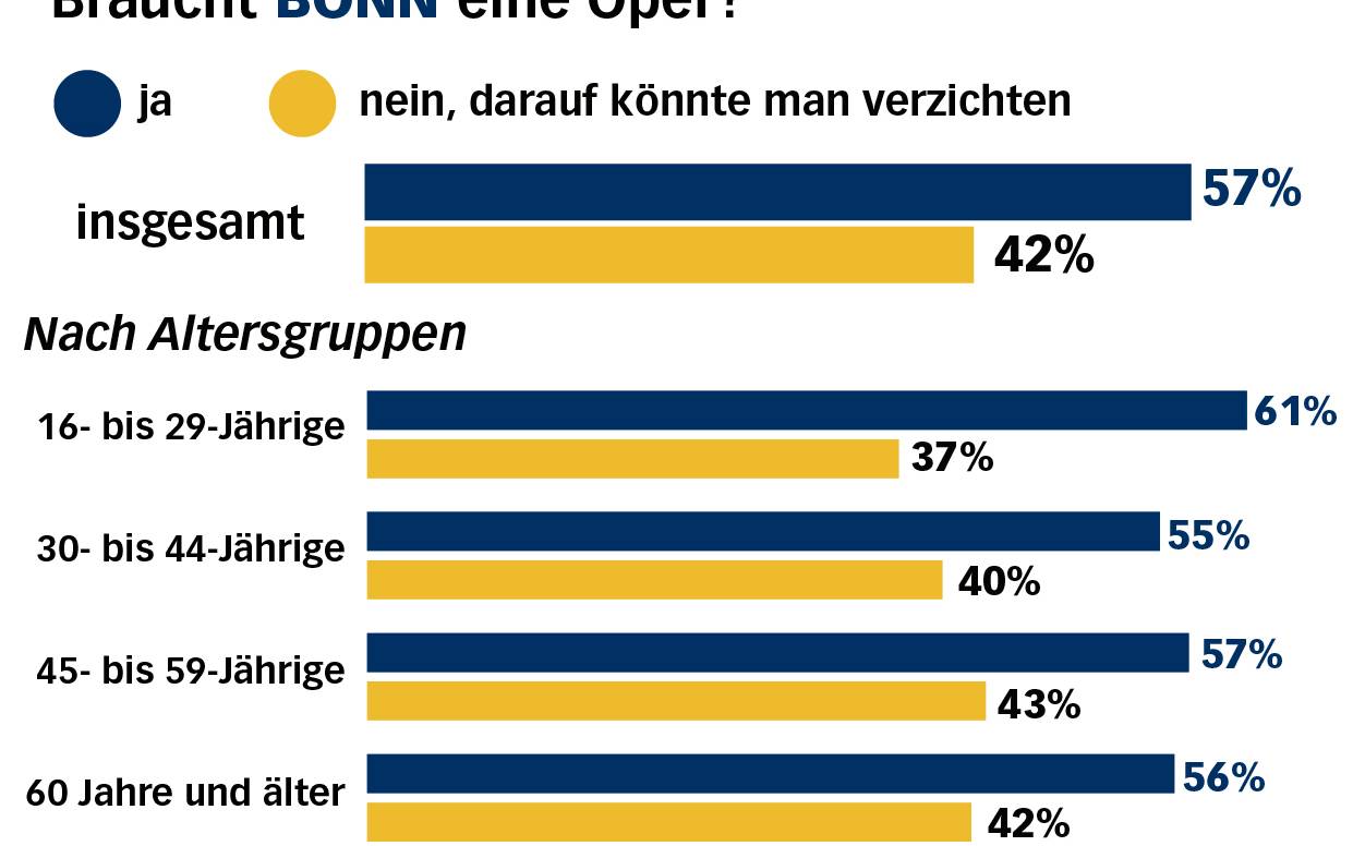 Auffällig ist: Es sind deutlich mehr Frauen als Männer, die sich für die Bonner Oper aussprechen. Etwas überraschend: Den größten Zuspruch bekommt die Oper von der Altersgruppen der 16- bis 29-Jährigen. Außerdem haben wir nach der Sanierung der Beethovenhalle gefragt. Dabei kam heraus, dass sich 57 Prozent der von Forsa befragten dafür aussprechen, dass die Beethovenhalle fertig saniert werden soll, nur 37 Prozent waren der Meinung, dass das Projekt Beethovenhalle beendet werden soll.