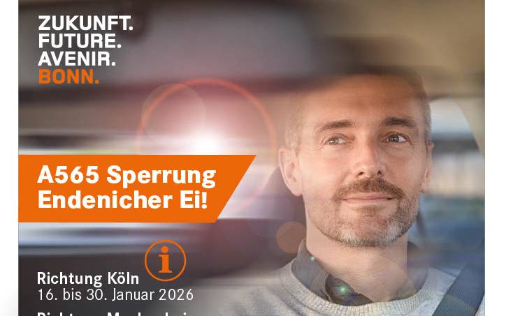Konkret soll es in Fartrichtung Köln Mitte Januar losgehen, am 16. bis zum Monatsende wird die dortige Richtungsautobahn gesperrt. Vom 1. Februar bis zum 11. Februar ist dann die andere Richtung dicht. Die Stadt Bonn möchte, dass alle Pendler auf der Strecke rechtzeititg informiert sind. Sie unterstützt deshalb eine entsprechende Plakatkampagne. Damit wird die nächste Sperrung am Endenicher Ei voraussichtlich gleichzeitg zum Verbot von Fahrzeugen mit über 7,5 Tonnen auf der Bonner Nordbrücke erfolgen.