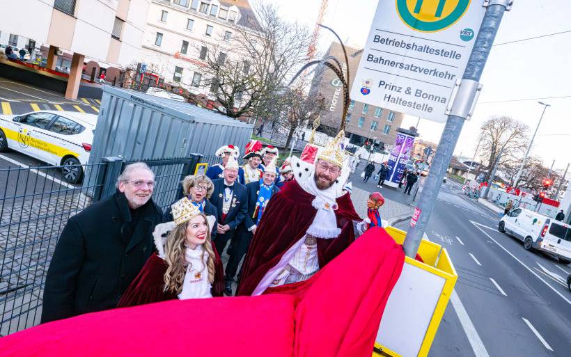An der Leitstelle von SWB Bus und Bahn stellen sich die Bonner Tollitäten jedes Jahr beim Rosenmontagszug auf. Zum Jubiläum "200 Jahre Bonner Karneval" sei man jetzt auf die Idee gekommen, diesen Ort im Stadtbild dauerhaft zu würdigen und zu verankern, sagte Festausschuss-Präsidentin Marlies Stockhorst. Das Bonner Prinzenpaar enthüllte das weiße Schild mit der Aufschrift „Prinz & Bonna Haltestelle“ und dem Wappen des Festausschusses am Nachmittag. Die neue Haltestelle des Prinzenpaars dient im Alltag nicht dem regulären Fahrgastwechsel, heißt es. Sie wird nur ab und zu von Bahnersatzbussen angesteuert - am 16. Februar dann erstmals vom Prinzenwagen.