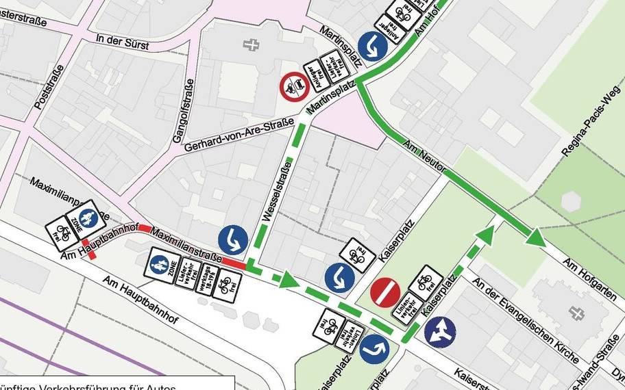 Eigentlich sollten erst noch Fahrbahnmarkierungen geändert werden, und erst wenn das alles fertig gewesen wäre, sollte die Kappung des City-Ringes in Kraft treten. Nun gilt aber bereits heute, dass der Verkehr von der Rathausgasse kommend über die Straße "Am Neutor" geführt wird. Die Durchfahrt durch die Wesselstraße ist nicht mehr möglich. Am Kaiserplatz ist die Durchfahrt über die Kaiserstraße in Richtung Hauptbahnhof ebenfalls nicht mehr erlaubt, der Verkehr wird zur Adenaueralle geleitet.
