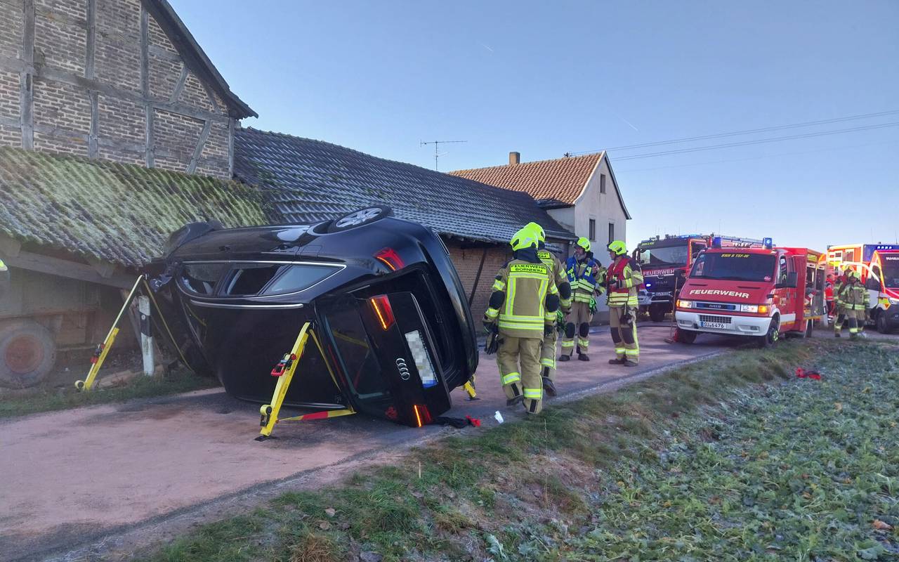 Das Auto rutschte ungebremst gegen die Stützpfeiler eines Vordachs, was daraufhin einstürzte. Der Wagen landete auf der Seite. Bei dem Unfall wurde die 57-jährige Beifahrerin schwer verletzt. Die Feuerwehr musste sie durch ein Seitenfenster aus dem Auto befreien. Sie kam ins Krankenhaus. Der 61-jährige Fahrer konnte das Auto selbst und unverletzt verlassen, heißt es von der Feuerwehr.
