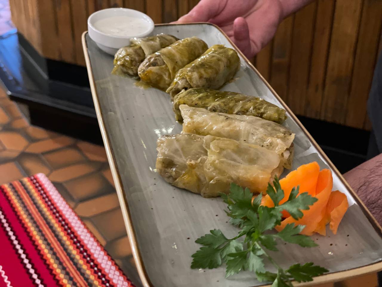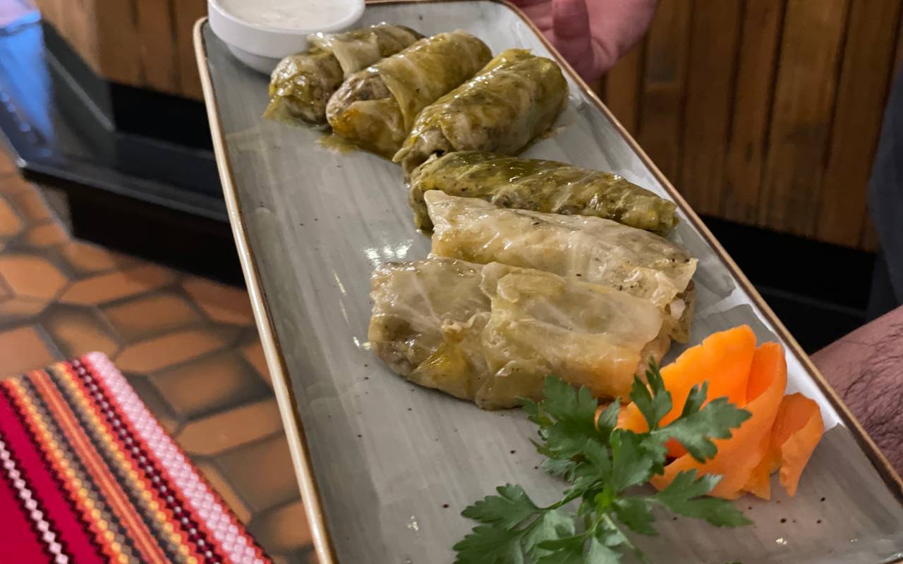 Auf den Fotos seht ihr einmal die bugarische Fleischplatte für 2 Personen mit Gemüse und Käse auf allen Fleischstücken. Das andere Foto zeigt Sarmi. Sarmi sind Hackfleisch und Reis in Kohlblättern gewickelt mit einer Knoblauchsauce. Eine Mischung aus den griechischen, gefüllten Weinblättern und deutschen Kohlrouladen.