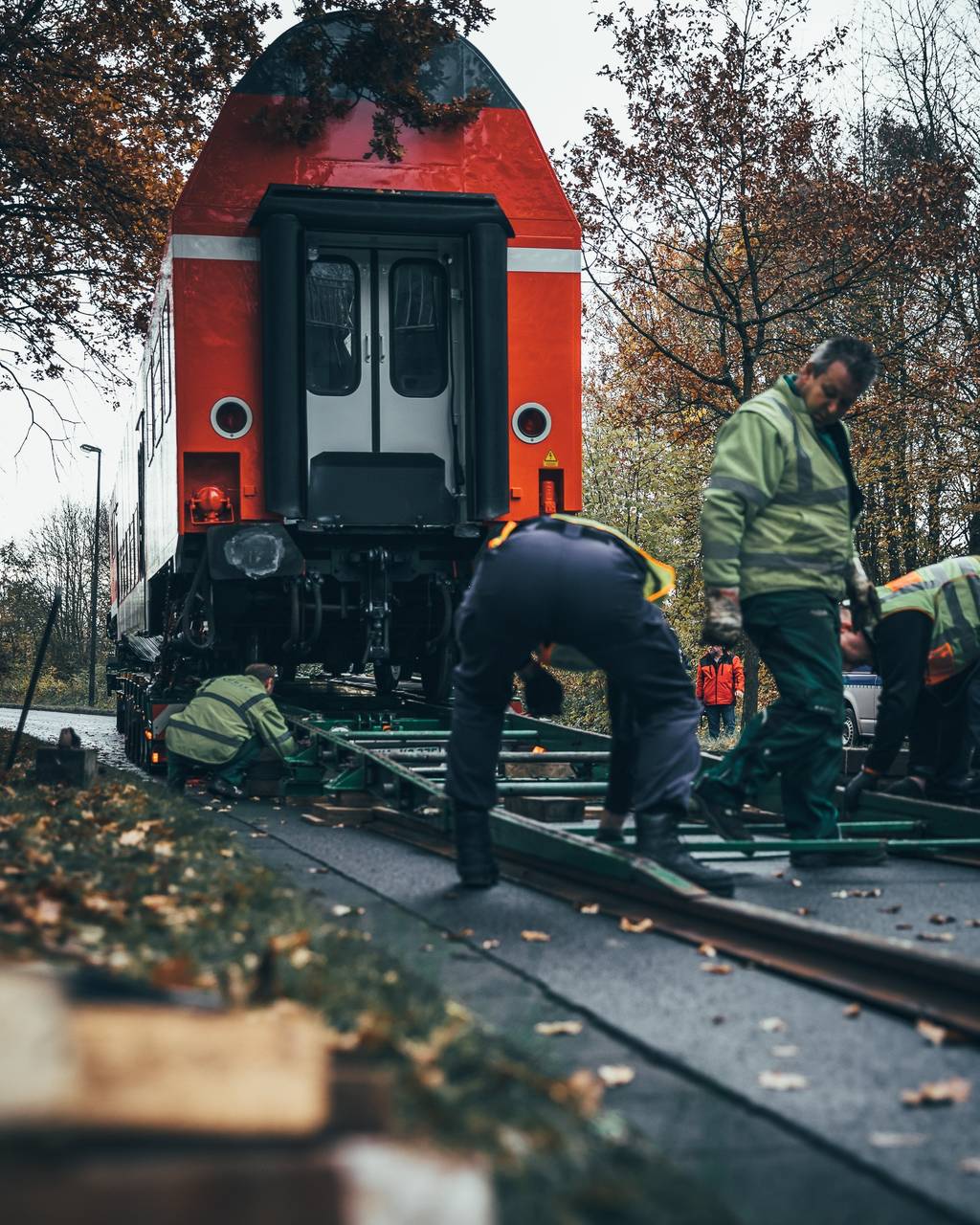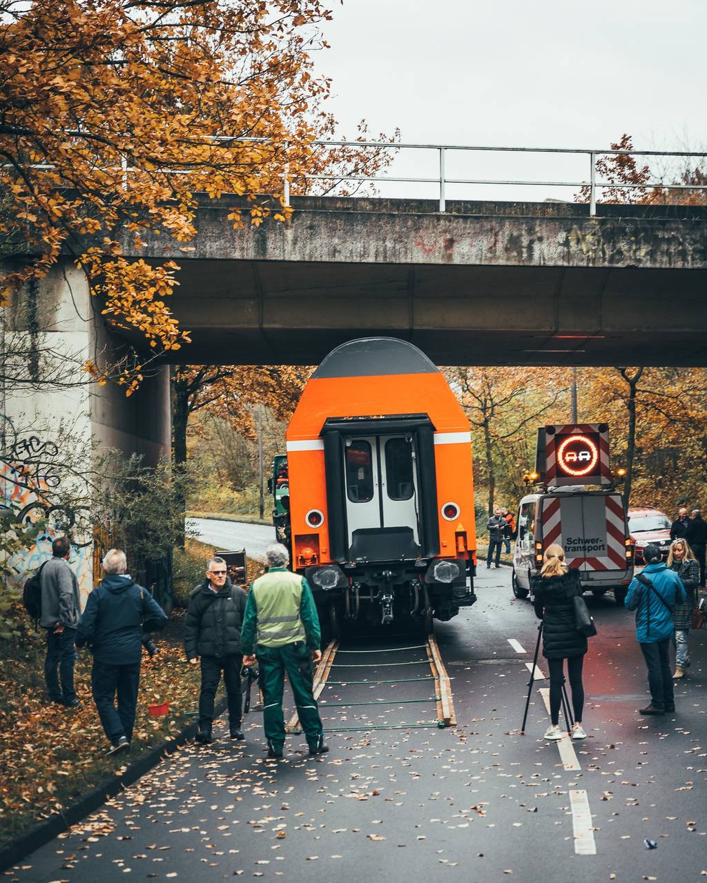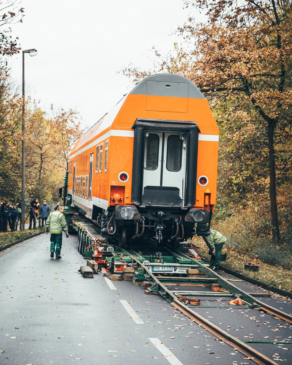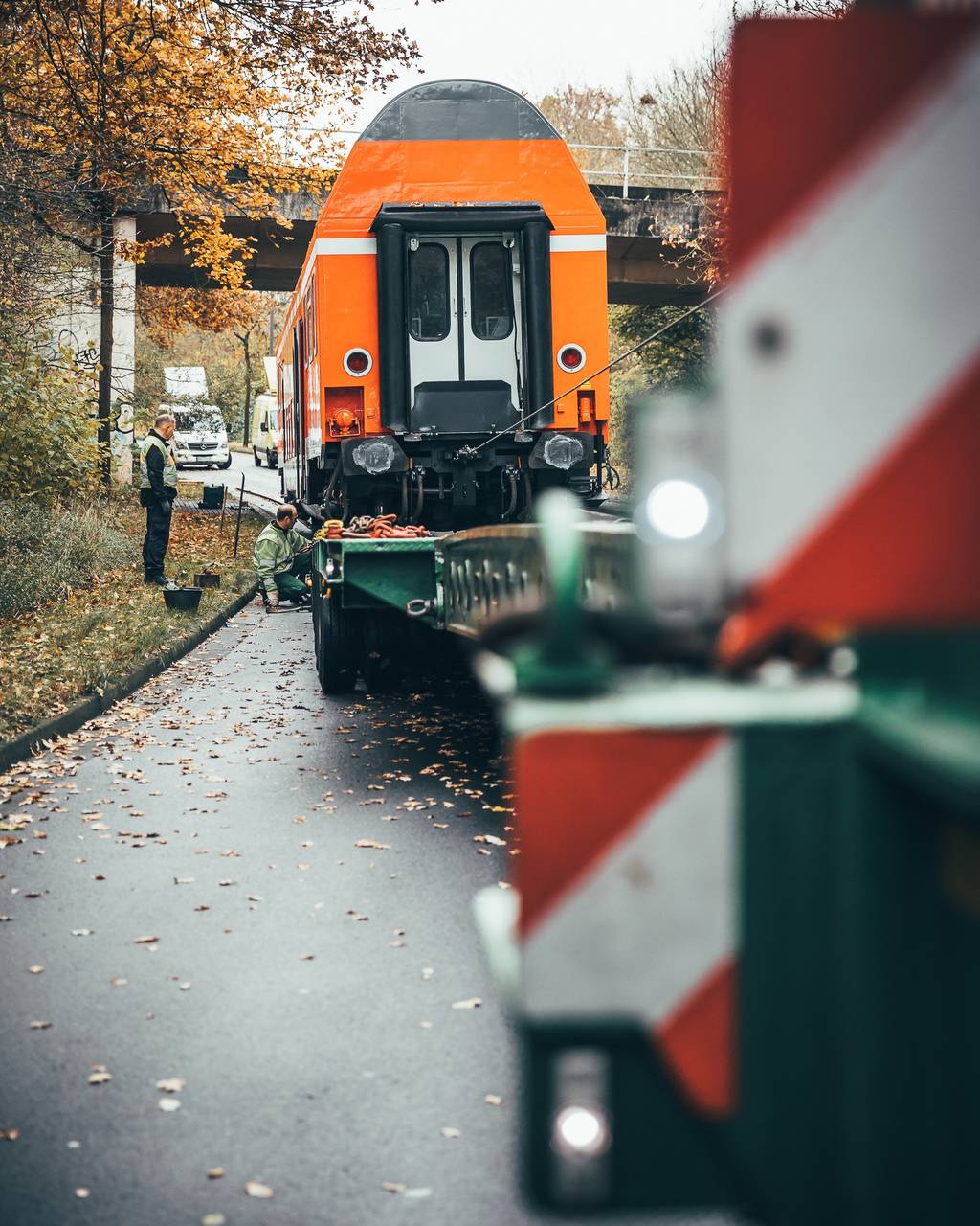 Darin sollen die Bundespolizisten später für echte Einsätze in Zügen üben. Dabei geht es zum Beispiel um die An- und Abreise von Fußballfans oder Demonstranten. Ein Problem ist die Höhe des Waggons: Weil der Wagen auf dem Tieflader nicht durch eine Unterführung passt, werden dort provisorische Gleise auf der Straße verlegt. Der Waggon wird abgeladen, über die Gleise durch die Unterführung geschoben und dann wieder aufgeladen. Um 15 Uhr soll das Projekt abgeschlossen sein.