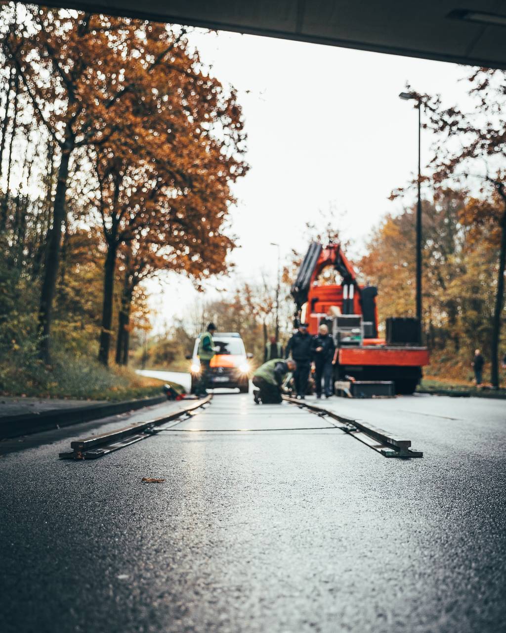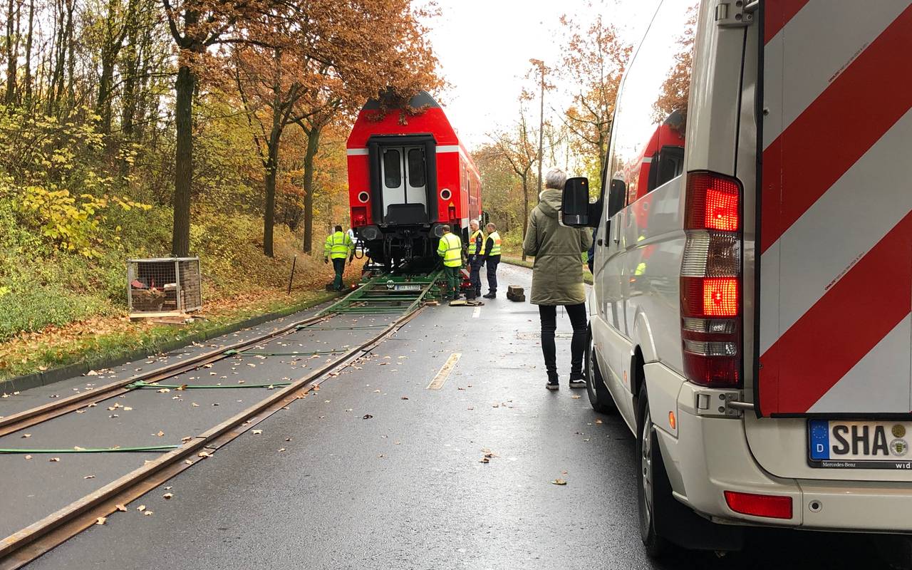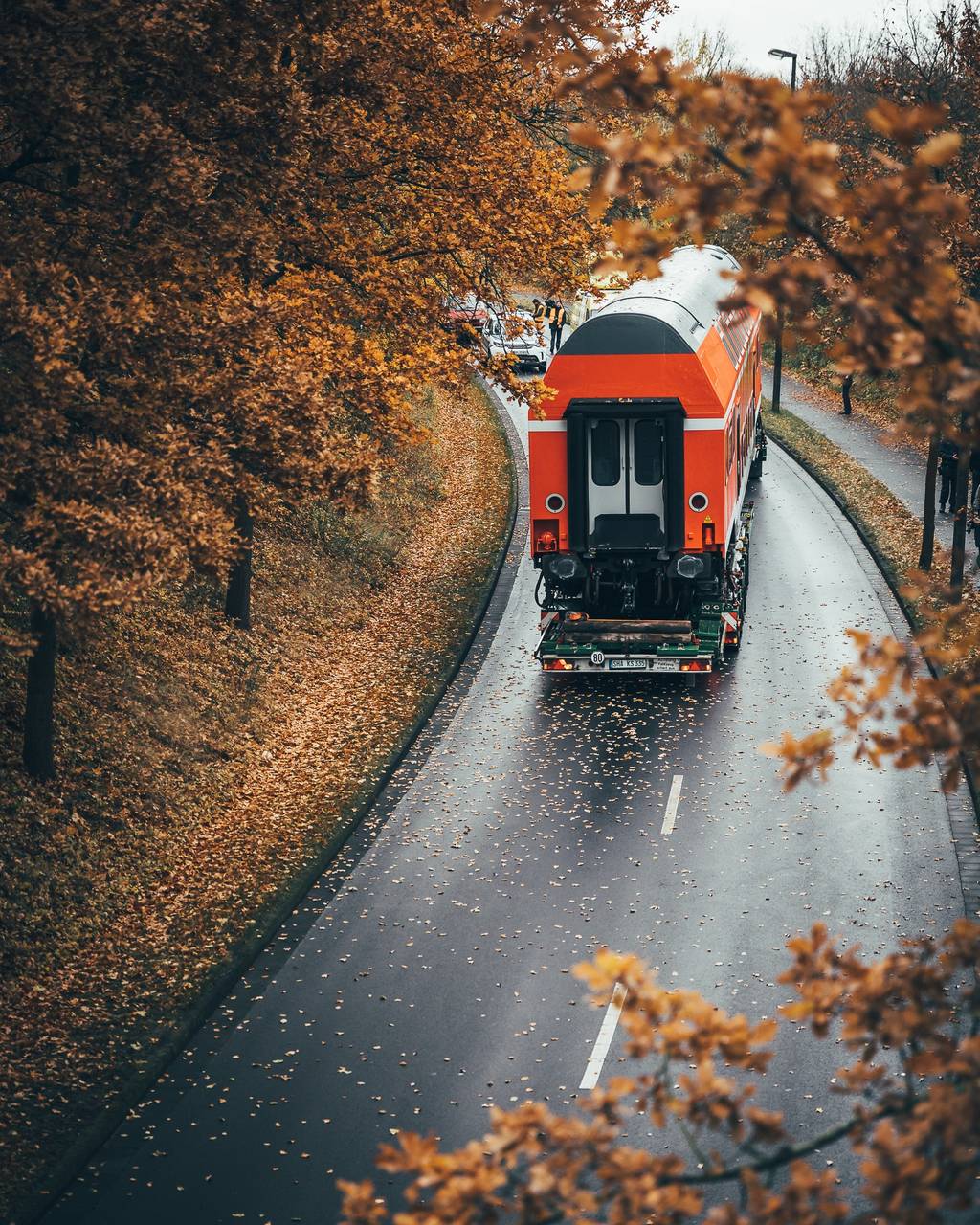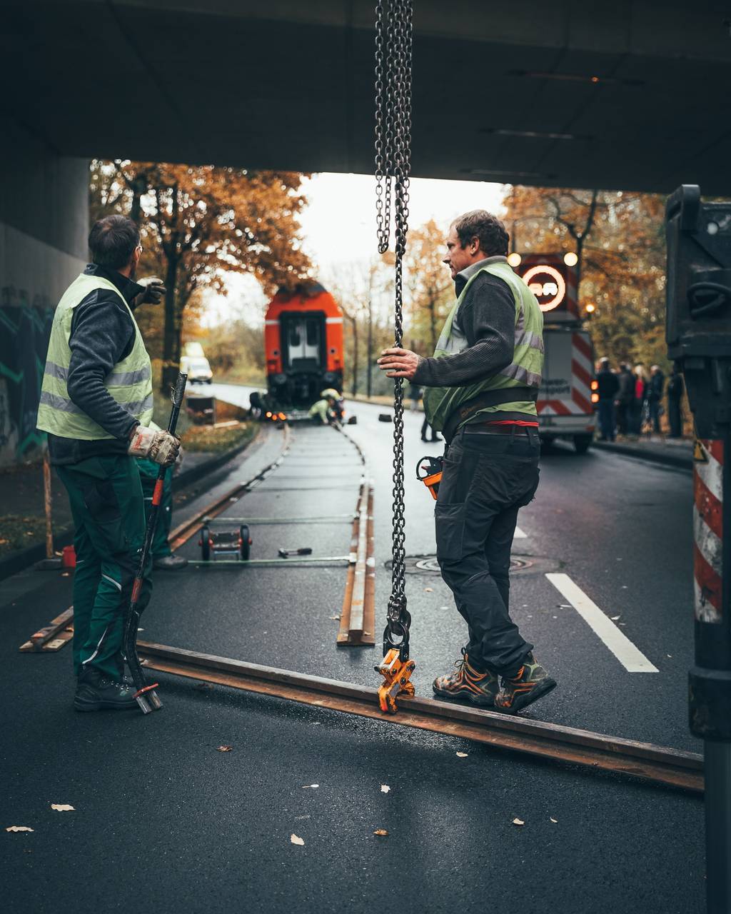 Darin sollen die Bundespolizisten später für echte Einsätze in Zügen üben. Dabei geht es zum Beispiel um die An- und Abreise von Fußballfans oder Demonstranten. Ein Problem ist die Höhe des Waggons: Weil der Wagen auf dem Tieflader nicht durch eine Unterführung passt, werden dort provisorische Gleise auf der Straße verlegt. Der Waggon wird abgeladen, über die Gleise durch die Unterführung geschoben und dann wieder aufgeladen. Um 15 Uhr soll das Projekt abgeschlossen sein.