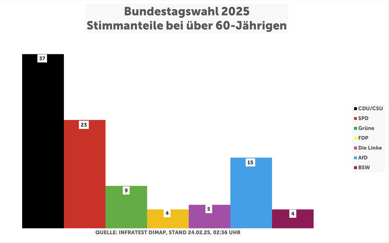 26 Prozent für Die Linke, 21 Prozent für die AfD. Das ist das Wahlergebnis für junge Wählerinnen und Wähler im Alter von 18 bis 24 Jahren bei der Bundestagswahl 2025. Laut Forschungsgruppe Wahlen wurden in diesem Alterssegment also vor allem die Ränder gewählt. CDU/CSU, SPD, Grüne oder FDP lagen zwischen 6 und 13 Prozent. Bei den über 60-Jährigen dominieren vor allem die gesetzten Parteien. CDU/CSU erreichen 38 Prozent, die SPD kommt auf 23 Prozent.
