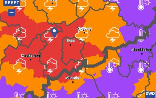 Aktuell zieht ein Unwetter durchs Radio Bonn/Rhein-Sieg-Land - der Deutsche Wetterdienst warnt, zum einen vor extremer Hitze, aber bis 18 Uhr auch vor starkem Gewitter, Starkregen, Hagel und Böen.