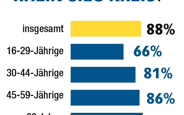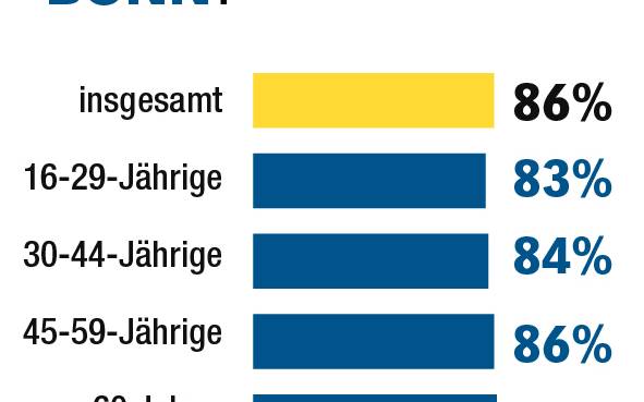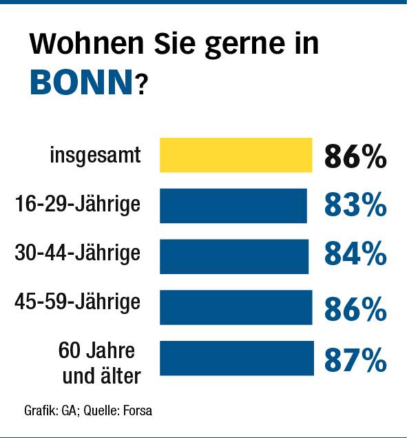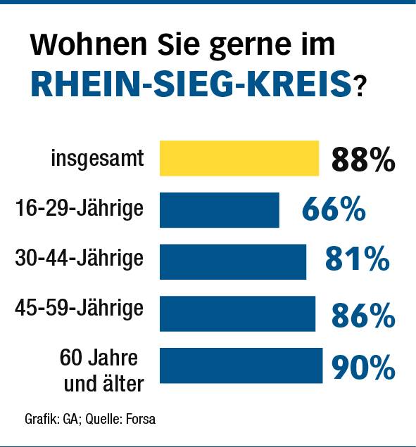 Zum Vergleich: Nur 77 Prozent der Menschen in ganz NRW sagen, dass sie gerne in ihrem Bundesland wohnen. Das spricht für eine hohe Identifikation mit unserer Region. Besonders groß ist im Kreis die Zufriedenheit der über 60 Jährigen - hier geben 90 Prozent an, gerne in ihrem Wohnort zu leben, in der Altersgruppe 16 bis 29 sind es dagegen nur 66 Prozent. In Bonn gibt es kaum einen Unterschied zwischen den Altersschichten.