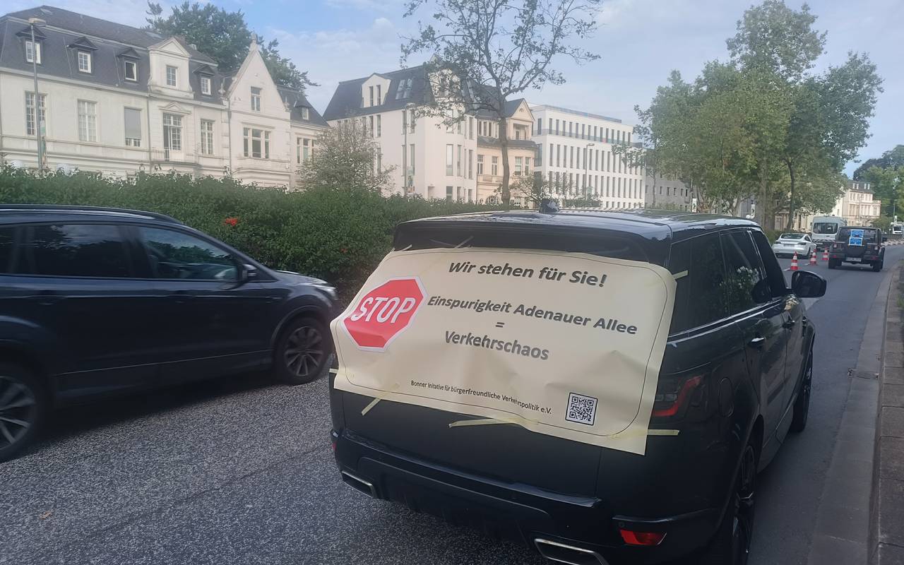 Die "Bonner Initiative für bürgerfreundliche Verkehrspolitik" wollte zeigen, was es heißt, wenn hier in Zukunft nur noch eine Spur für Autos zur Verfügung steht. Die andere Spur soll eine gesicherte Radspur werden. Deshalb blockierte die Initiative für etwa zwei Stunden den Außenstreifen Richtung City - zwischen dem Adenauer-Denkmal und dem Bundesrechnungshof. Die Bonner Ratskoalition hatte gerade erst angekündigt, genau das in einem dreimonatigen Versuch testen zu wollen, um Erfahrungen und verlässliche Daten zu sammeln. Dann sollen etwa auch Lieferzonen probeweise eingerichtet werden.