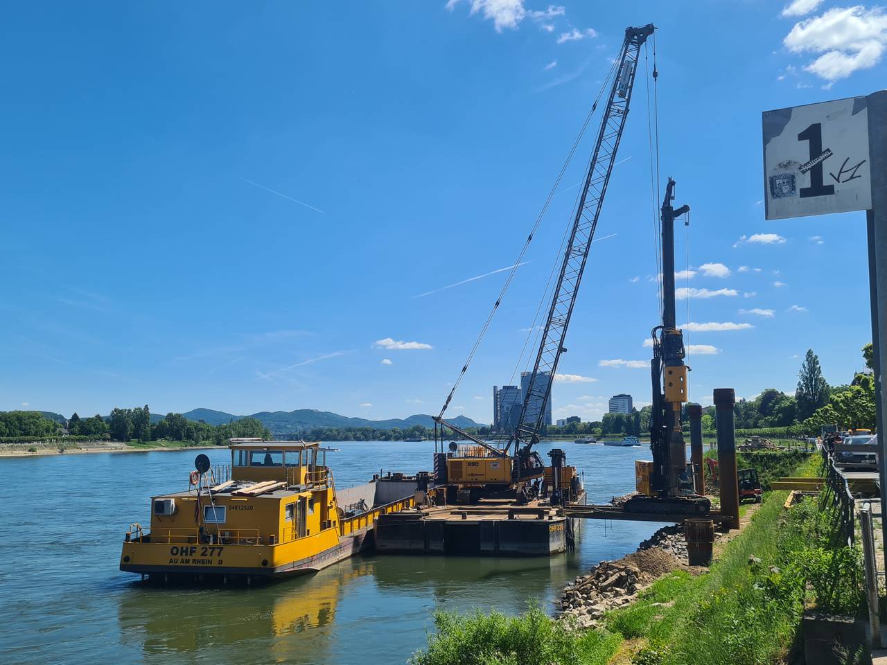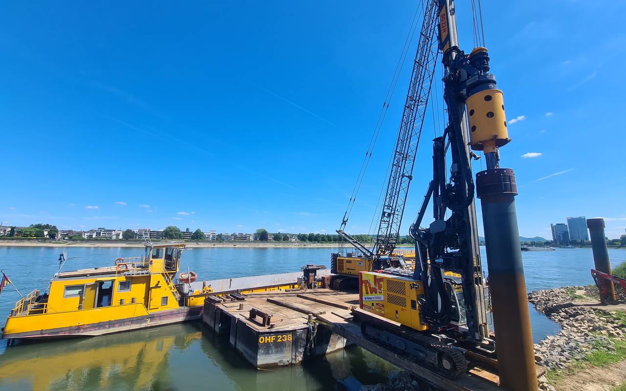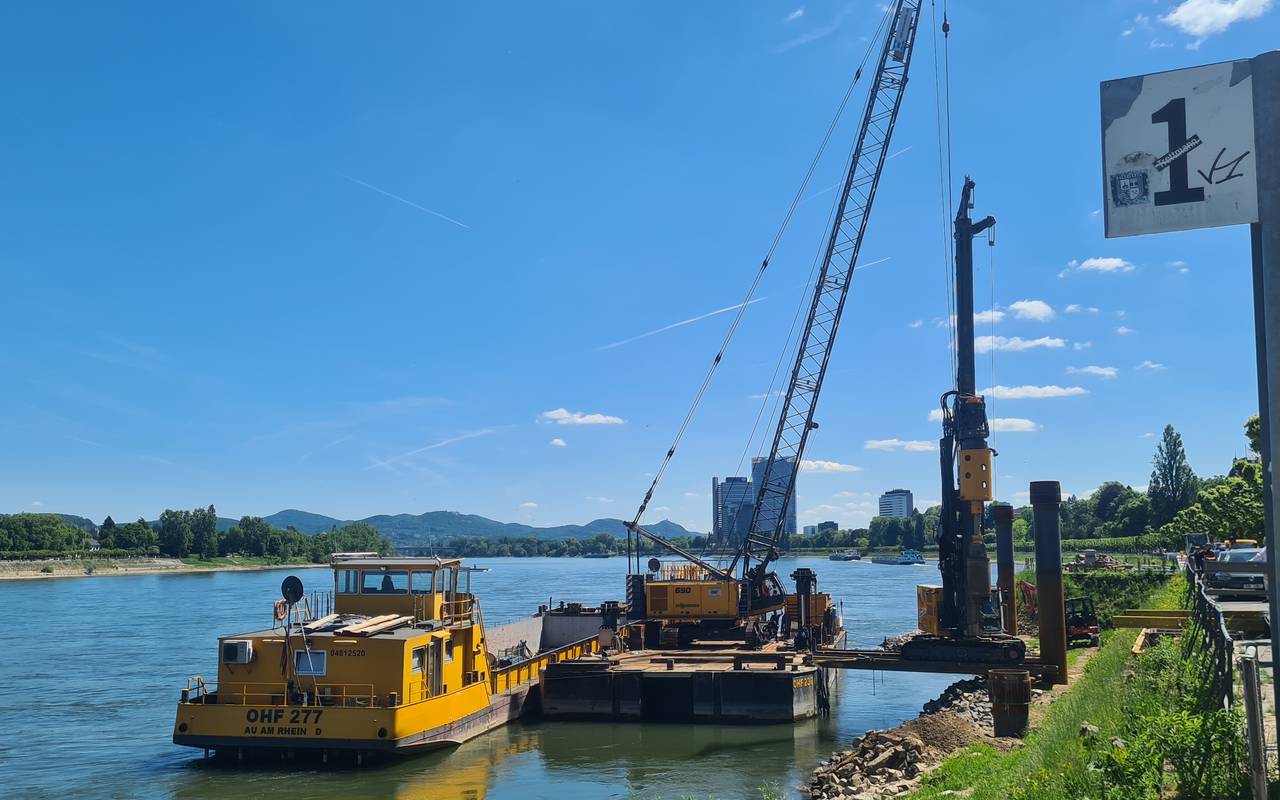 400.000 Euro nimmt die Bonner Personen Schiffahrt in die Hand, um das RBRS-Land attraktiver für Flusskreuzfahrten zu machen. Mit dem Geld wird gerade der Anleger 1 am Bonner Rheinufer ausgebaut. Hier sollen dann in Zukunft auch die größten Hotelschiffe anlegen können, die sind bis zu 135 Meter lang. Dafür muss der Anleger umgebaut werden, mit einem großen Kran werden aktuell dicke Stahlrohre ins Rheinufer gebohrt, die die großen Schiffe auch halten können.
