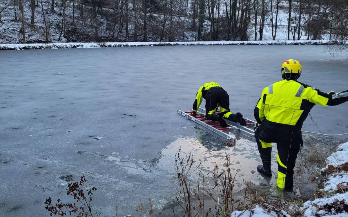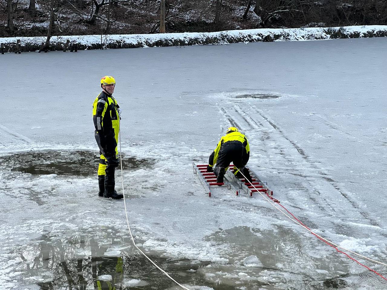 Mit Leitern auf dem Eis - die Freiwillige Feuerwehr ist vorbereitet für den Notfall