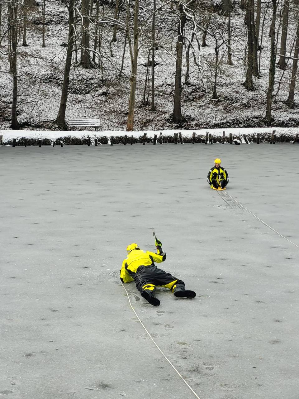 „Bitte betreten Sie keine Eisflächen!“ – Das ist der Appell der Feuerwehr Hennef. Im ganzen Stadtgebiet gebe es keine geprüften und freigegebenen Flächen. Man begebe sich also in Lebensgefahr. Um im Ernstfall trotzdem helfen zu können, hat die Einheit Stadt Blankenberg der Hennefer Feuerwehr die Menschenrettung auf einem zugefrorenen Teich geübt. Die Teilnehmer trugen dabei sogenannte Überlebens-, beziehungsweise Kälteschutzanzüge.