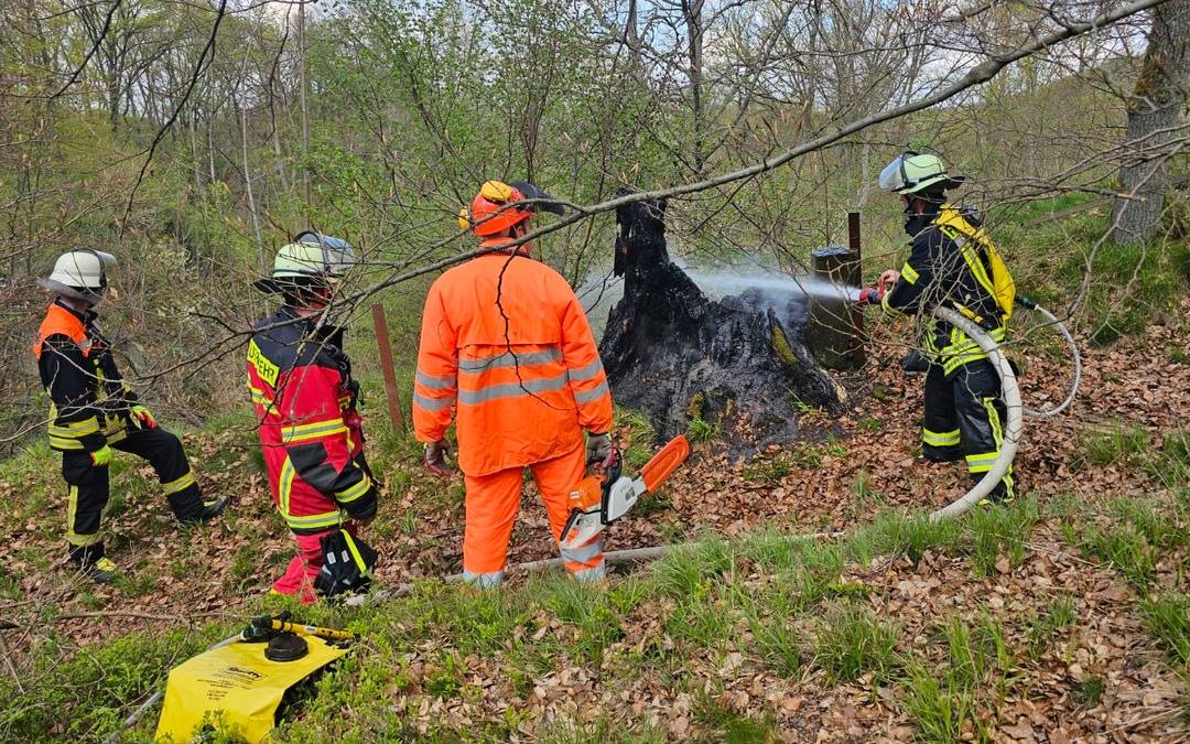Der Löschzug Ittenbach konnte gerade so Schlimmeres verhindern, denn als die Einsatzkräfte ankamen, hatten sich schon weitere Stellen des trockenen Waldbodens entzündet. Das Löschen war aufwendig, denn der inzwischen brennende Baumstumpf war direkt an einer Felskante, dort fiel auch schon Glut nach unten. Ein Feuerwehrmann wurde per Seil gesichert, um den Stumpf abzusägen und alle Glut zu löschen. Dann gruben die Feuerwehrleute den trockenen Waldboden auf und bewässerten ihn. Dafür mussten sie 150 Meter Schläuche über den Steinbruch verlegen. Der Einsatz dauerte zweieinhalb Stunden.