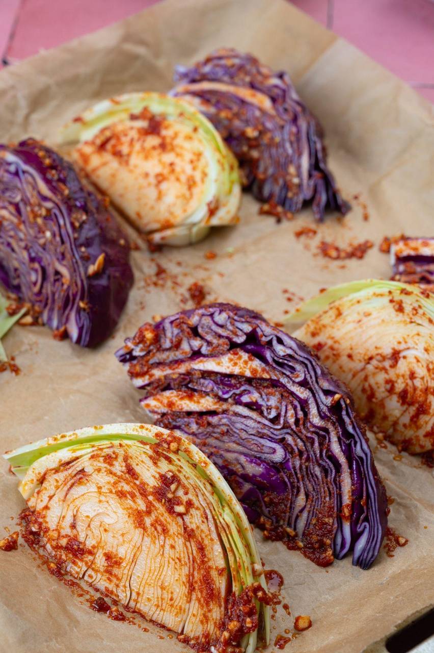 - Zunächst den in Spalten geschnitten Rotkohl mit einer Paste aus 2 pressten Knoblauchzehen, 2 EL Tomatenmark, 8 EL Olivenöl, 2 TL Cumin, 1 TL Cayennepfeffer, 1 TL Meersalz bestreichen und 45 Minuten bei 190 Grad im Backofen rösten.