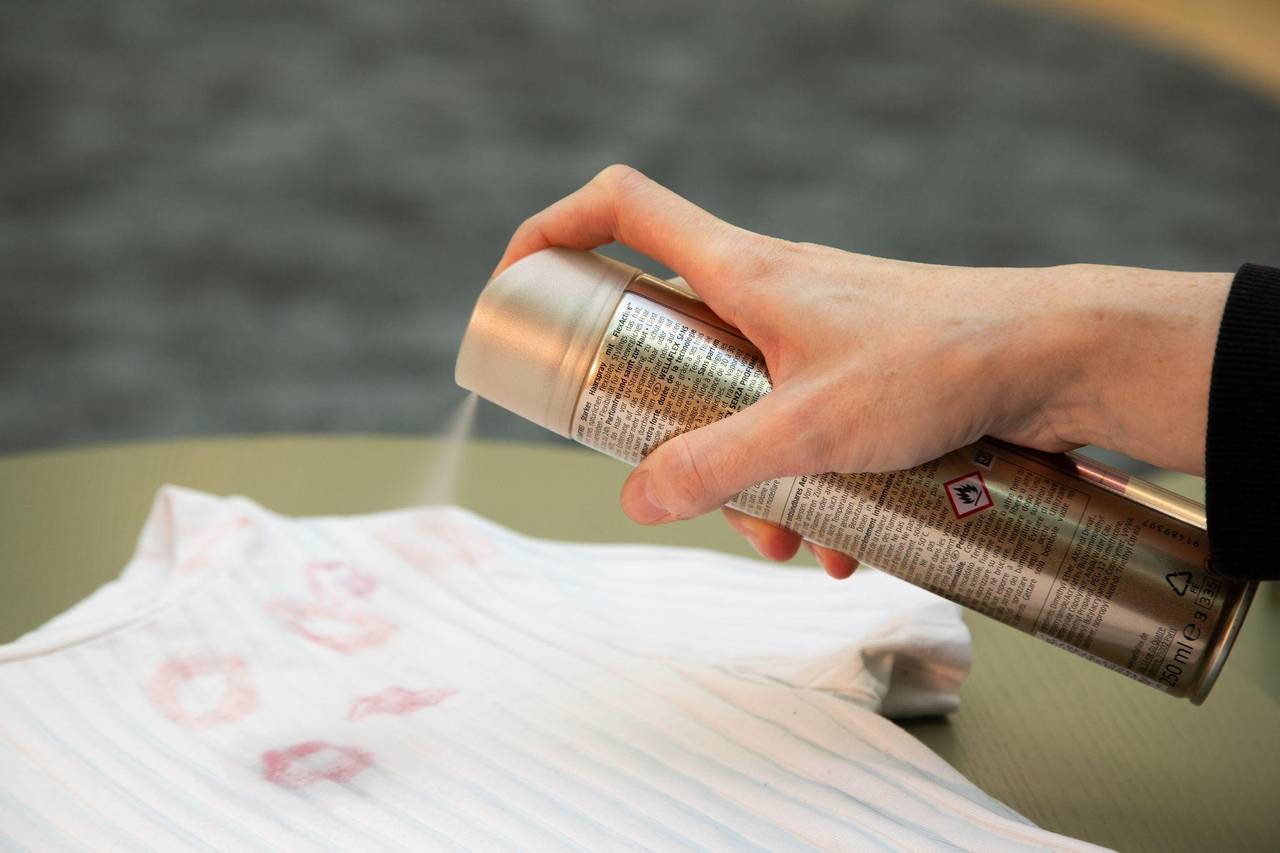 Schritt 1: Lippenstift-Flecken mit Haarspray einsprühen und zehn Minuten warten.