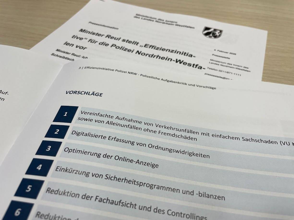 Die Gewerkschaft der Polizei (GdP) reagiert gemischt. Landeschef Patrick Schlüter sagt: Wenn es echte Entlastung gebe, stehe die GdP an der Seite des Ministers. Ein verstecktes Sparprogramm lehnt die Gewerkschaft aber ab. Kritisch sieht die GdP etwa Vorschläge zur Kürzung von Fortbildungen oder Änderungen beim Sporterlass. Zustimmung gibt es dagegen bei Ideen wie vereinfachter Unfallaufnahme oder weniger interner Bürokratie. Irritiert zeigt sich die Gewerkschaft auch über die neue Überschrift „Effizienzinitiative“. Besonders deutlich lehnt sie die mögliche Abschaffung der Verkehrsdirektion ab - gerade mit Blick auf Unfallzahlen und Verkehrstote.