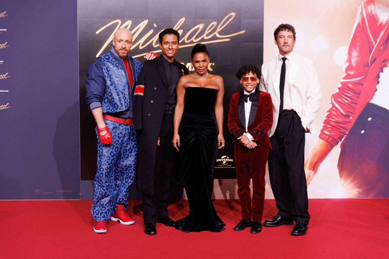 Cast-Mitglieder, darunter Jaafar Jackson (2. v. l.), kamen zur internationalen Premiere in Berlin. (Archivbild)© Carsten Koall/dpa