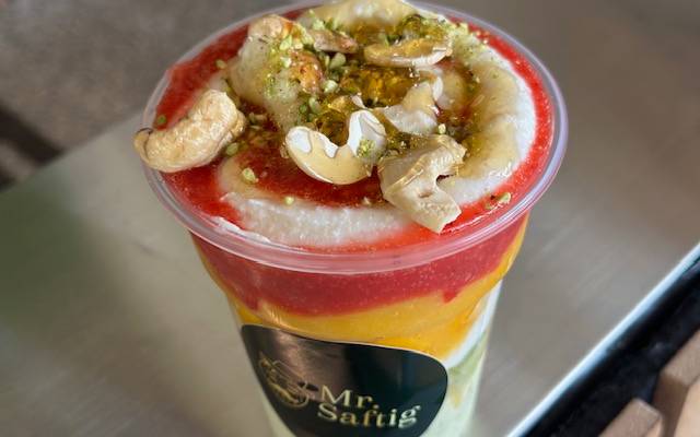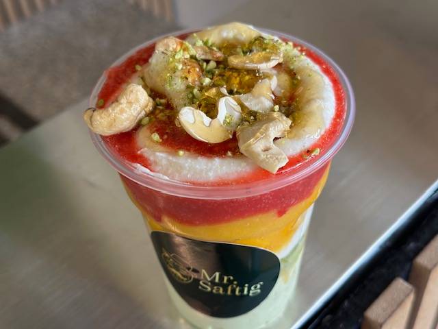 Mr. Saftig-Chef Rami und seine Mitarbeiterin bereiten alles frisch zu, nachdem man etwas bestellt hat. Dabei kann man dann zusehen, wie das Obst gemixt wird, Nüsse darüber gestreut oder mit Honig gesüßt werden. Es gibt sowohl Smoothies als auch Säfte.