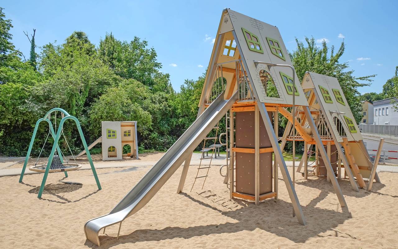 Es gibt eine Kletter- und Spielkombination für Kids bis 14 Jahre und einen Sandkasten für kleinere Kinder, der auch mit dem Rollstuhl erreicht werden kann. Es gibt eine barrierefreie Schaukel und eine Balancierstrecke. Auch der benachbarte Bolzplatz wurde gemacht: er hat neue Ballfangzäunde bekommen. Der neue Spiel- und Bolzplatz hat rund 520.000 Euro gekostet, es wurden laut Stadt viele Wünsche der Anwohner umgesetzt.