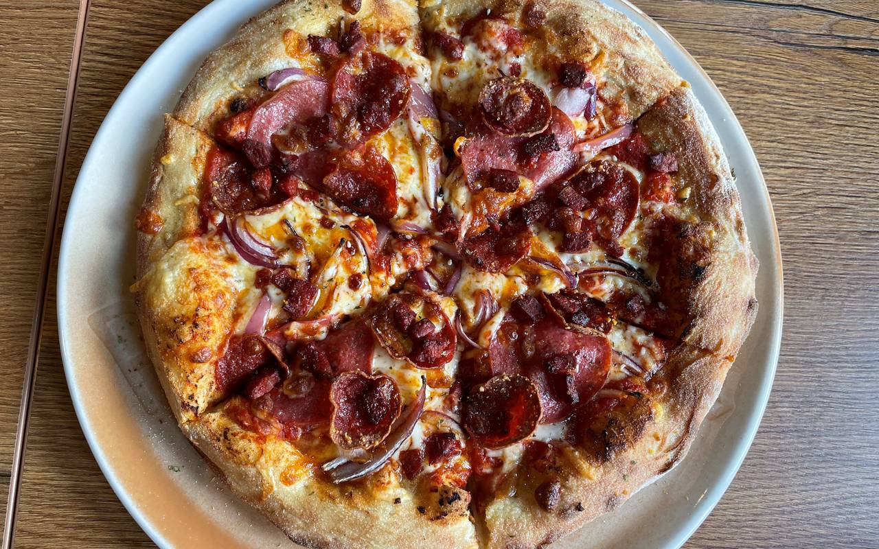 Begeistert war Karin vom Pizzateig. Dieser wird handgefertigt, mit Olivenöl, ruht 48 Stunden und wird mit Grießmehl bestreut. Dadurch gibt es eine schöne Textur und der Boden ist New York Style, also ein kleines bisschen dicker, aber schön fluffig. Gerade für den Lieferdienst gut geeignet.