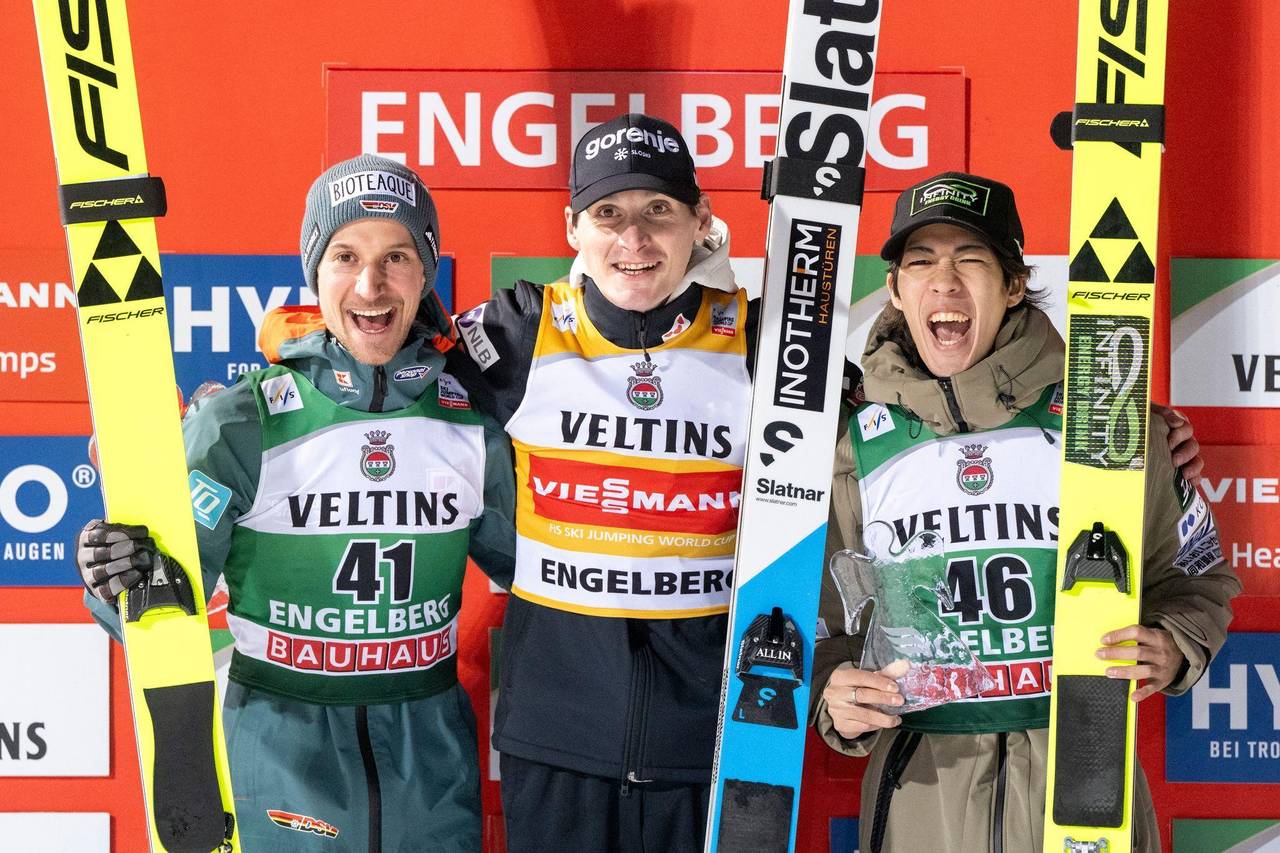 Nur Dauersieger Prevc (M) war am Samstag stärker als Hoffmann.© Urs Flueeler/KEYSTONE/dpa