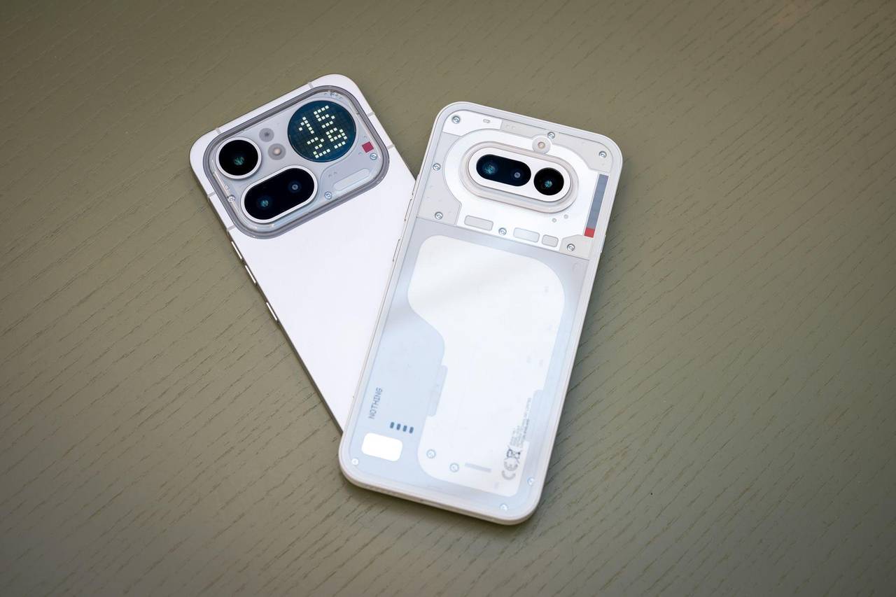 Das Nothing Phone (4a) Pro (r) lehnt an dem Nothing Phone (4a)