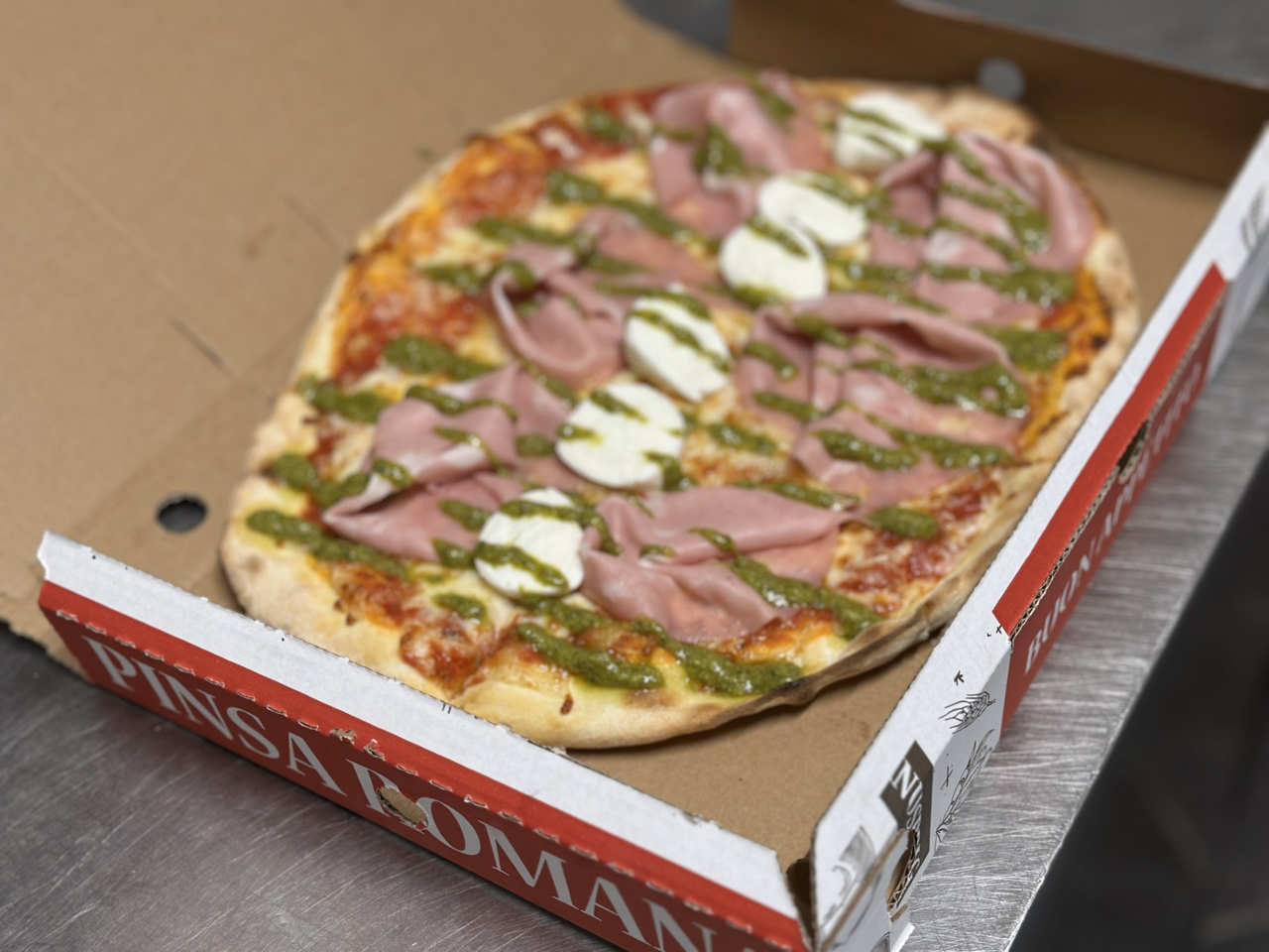 Obwohl der Betrieb „Pinsa“ heißt, erinnert die Form zwar an eine Pinsa, jedoch handelt es sich bei der Basis um einen klassischen römischen Pizzateig. Karin, die diesen Anbieter getestet hat, gibt zu, dass der Name zwar etwas irreführend sein könnte, aber der Geschmack der Pizzen – ob zum Abholen oder Liefern – überzeugt auf ganzer Linie. Hier merkt man die 30 Jahre Erfahrung in der Pizzaproduktion!