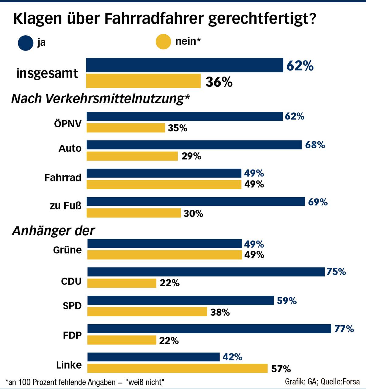 Dass sich Radfahrer oftmals rücksichtslos verhalten, sehen sowohl Autofahrer aber auch viele Radfahrer selbst so. Das zeigt die repräsentative Forsa-Umfrage, die Radio Bonn/Rhein-Sieg und der Generalanzeiger in Auftrag gegeben haben.