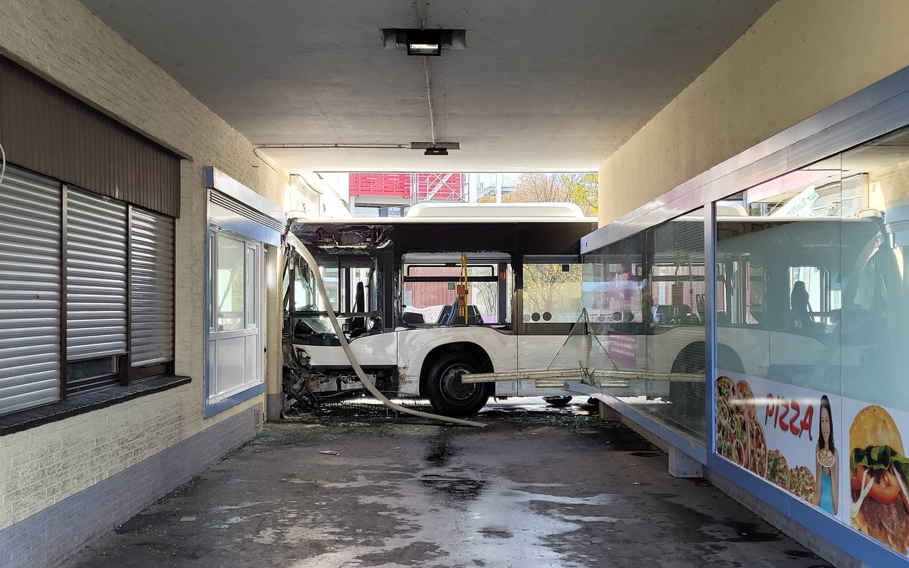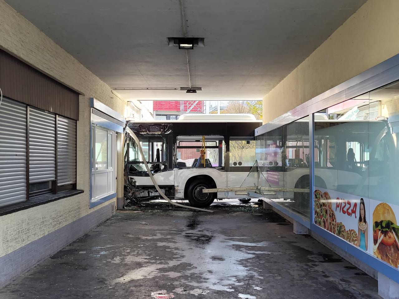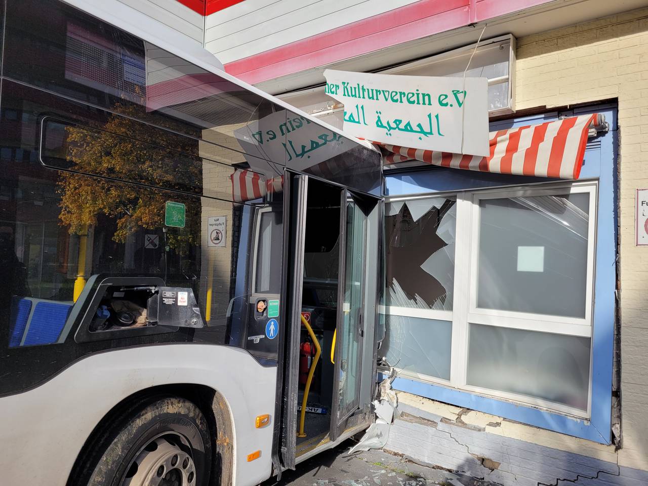 Aus noch unbekannten Gründen kam er dann laut Feuerwehr von der Fahrbahn ab, touchierte ein Taxi und fuhr in eine Ladenzeile. Dort wurden mehrere Schaufenster zerstört. Der Bus prallte gegen eine Hauswand und kam dann zum Stehen. Aktuell sind das Bauamt und ein Statiker vor Ort und prüfen das betroffene Gebäude.