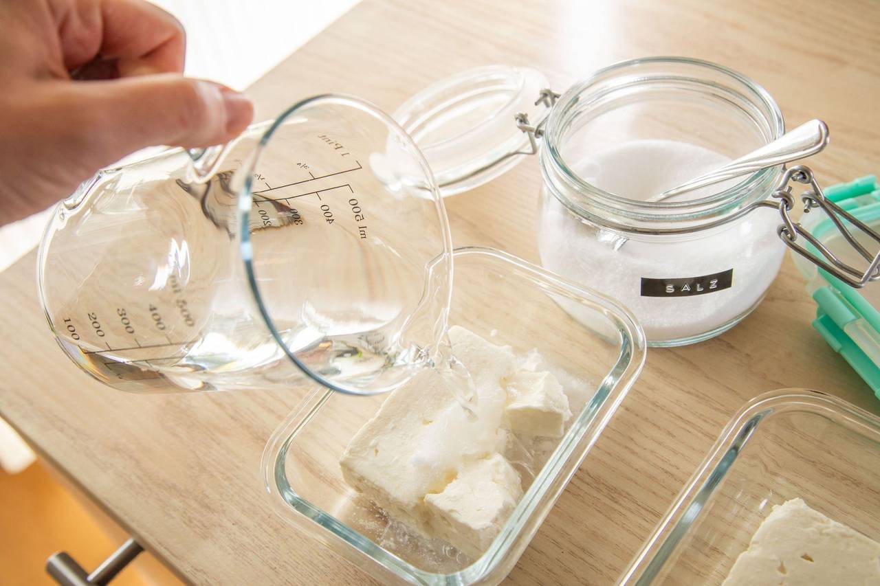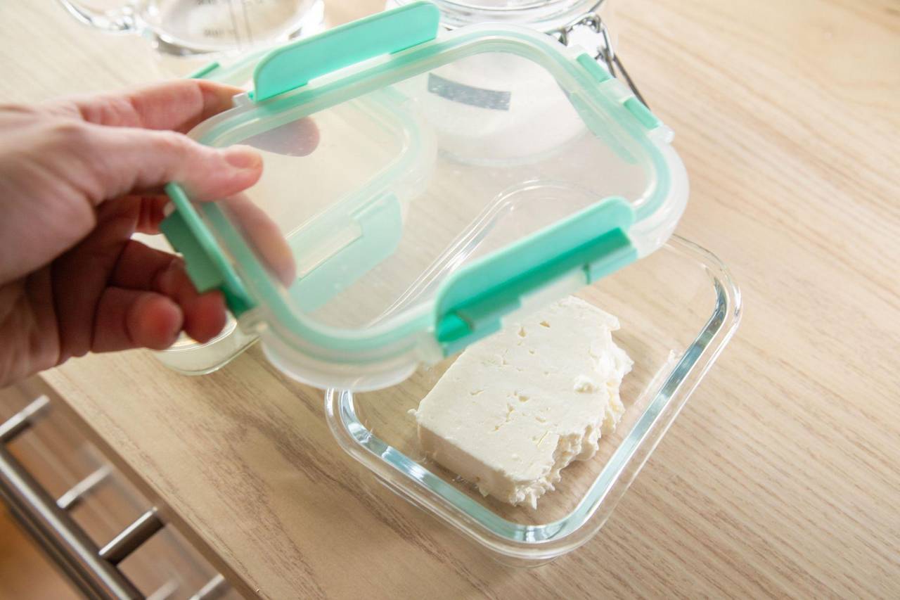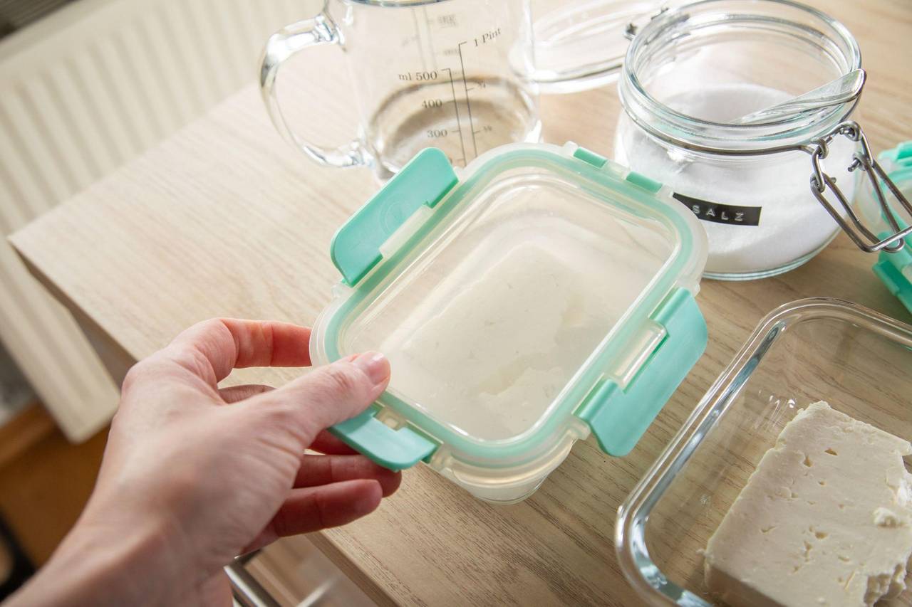 Zum Vergleich: Ein Feta ohne Salzlake wird ebenfalls in eine luftdichte Schale gegeben.© Christin Klose/dpa-tmn