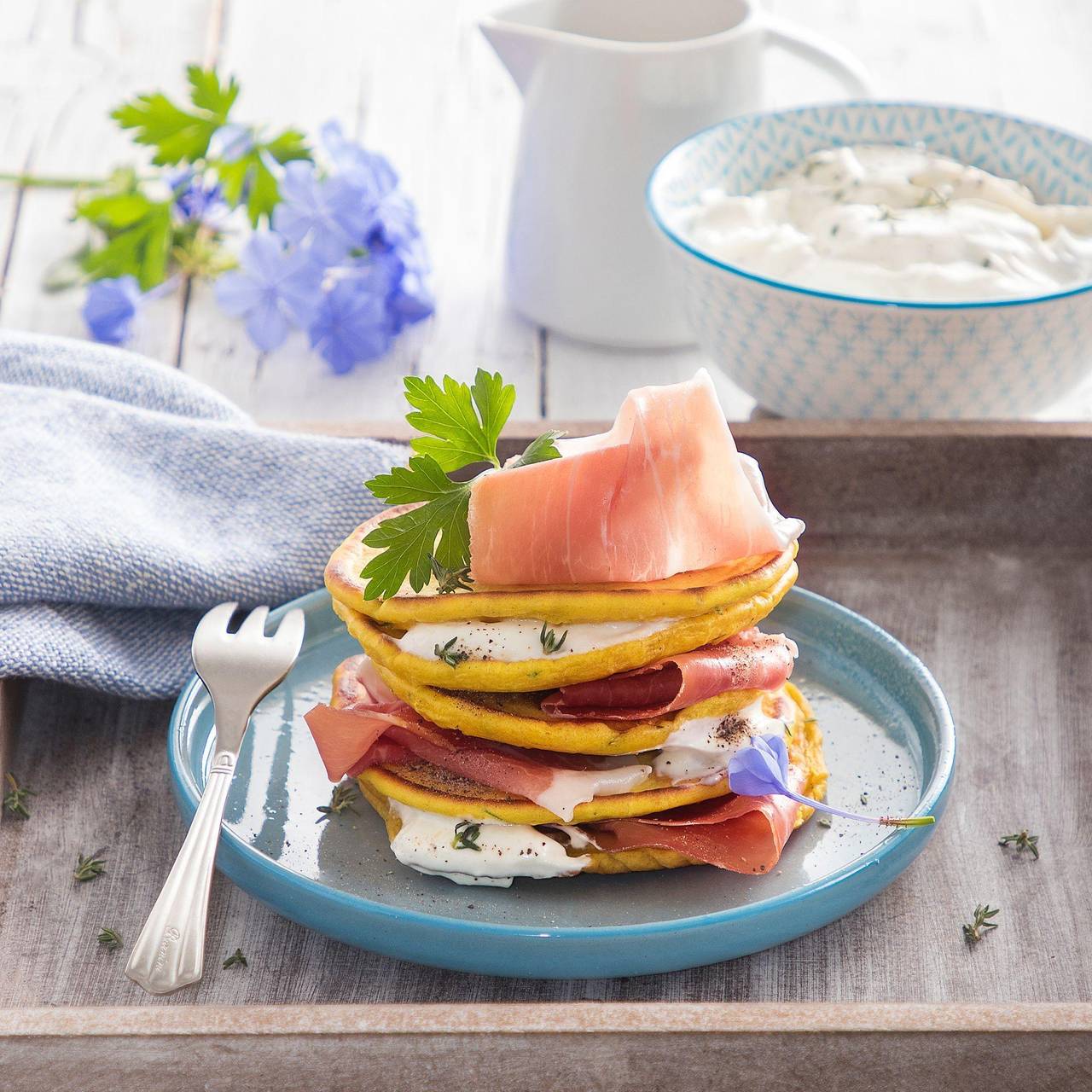 - Die Pfannkuchen mit der Joghurt-Creme bestreichen und jeweils eine Scheibe Parmaschinken darauf drapieren.