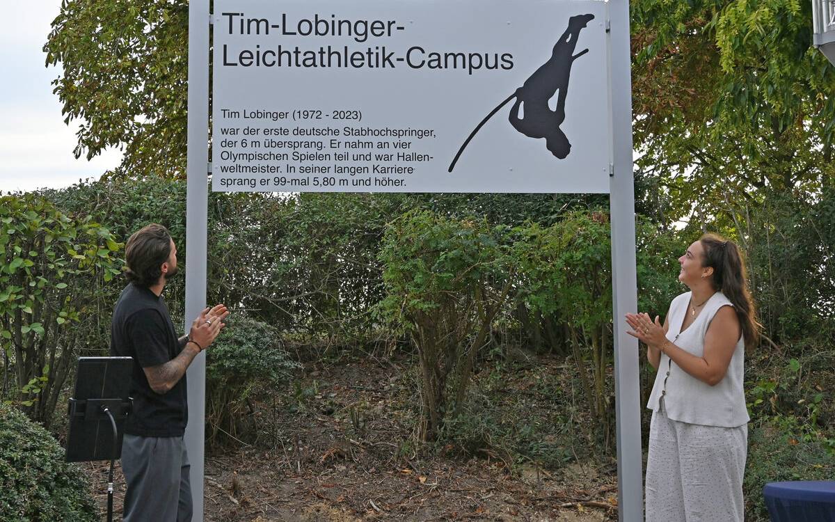Die Leichtathletikanlage am Schulcampus wurde jetzt nach ihm benannt. Tim Lobinger stand vor etwas mehr als zehn Jahren als "Markenbotschafter der Apfelstadt Meckenheim" Pate. Er war der erste Deutsche, der im Freien die magischen sechs Meter übersprang. 2023 starb Tim Lobinger mit gerade einmal 50 Jahren nach langer schwerer Krankheit an Krebs. Seine Kinder Lex-Tyger und Fee enthüllten das Schild für den Tim-Lobinger-Leichtathletik-Campus in Meckenheim.