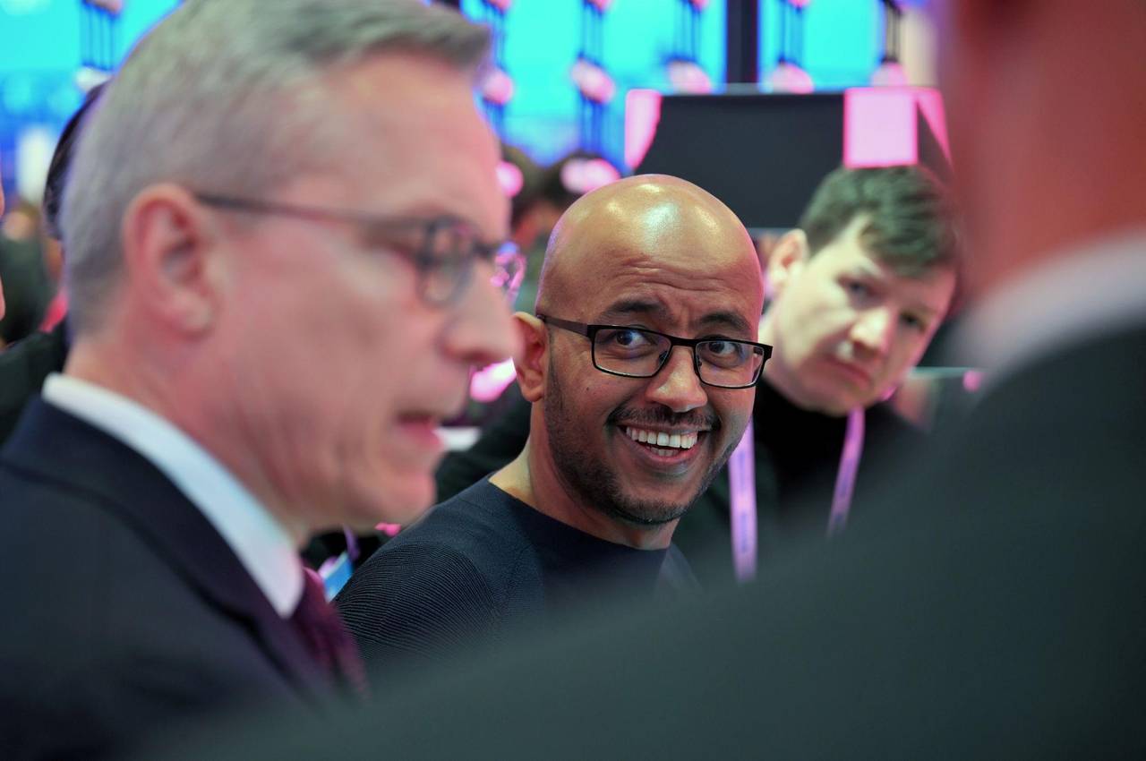 Telekom-Technologievorstand Abdu Mudesir (Mitte) bei einem Messerundgang mit Bundesdigitalminister Karsten Wildberger (links). © Wolf von Dewitz/dpa
