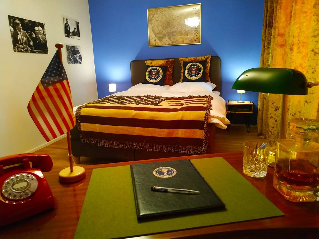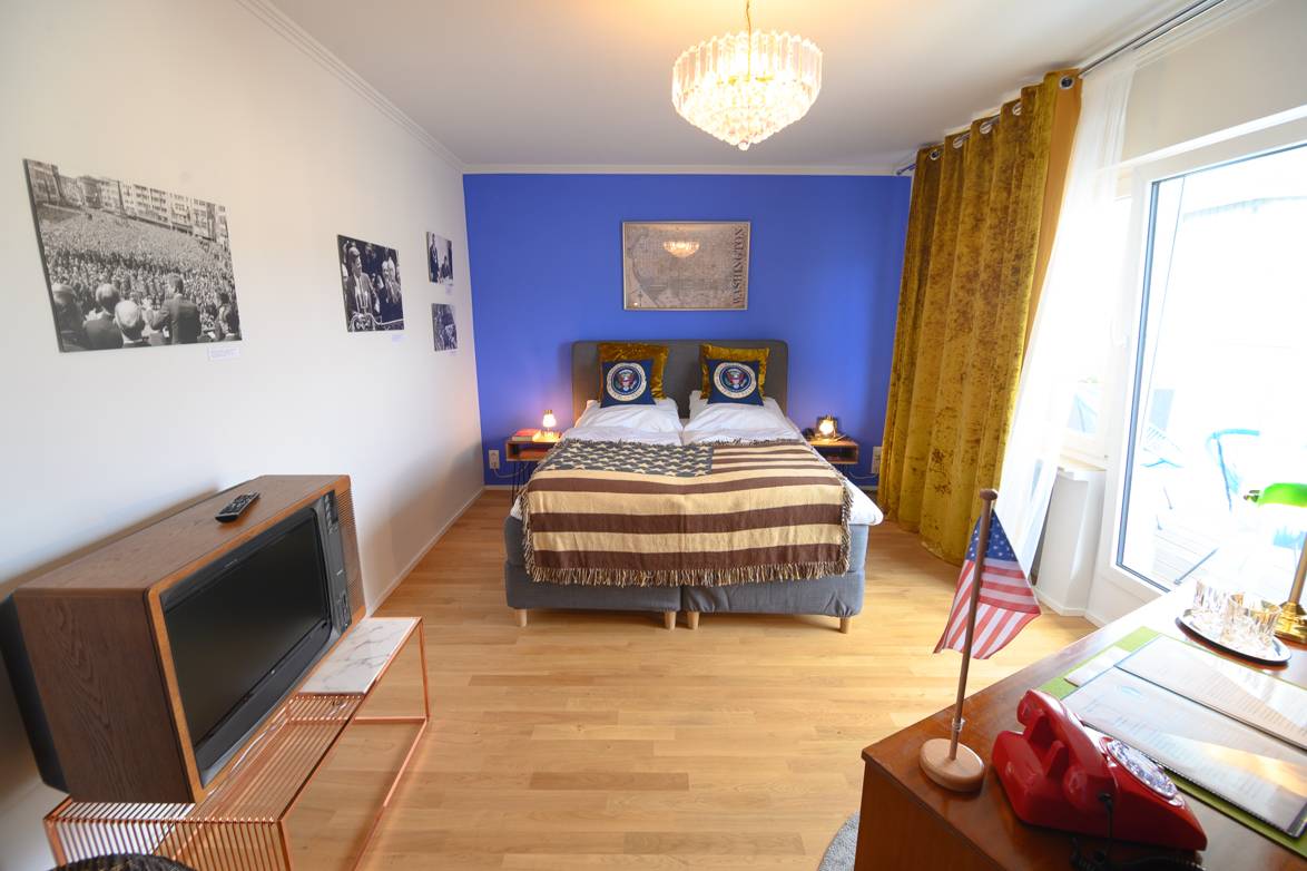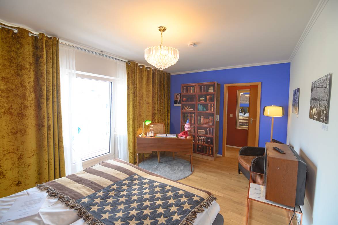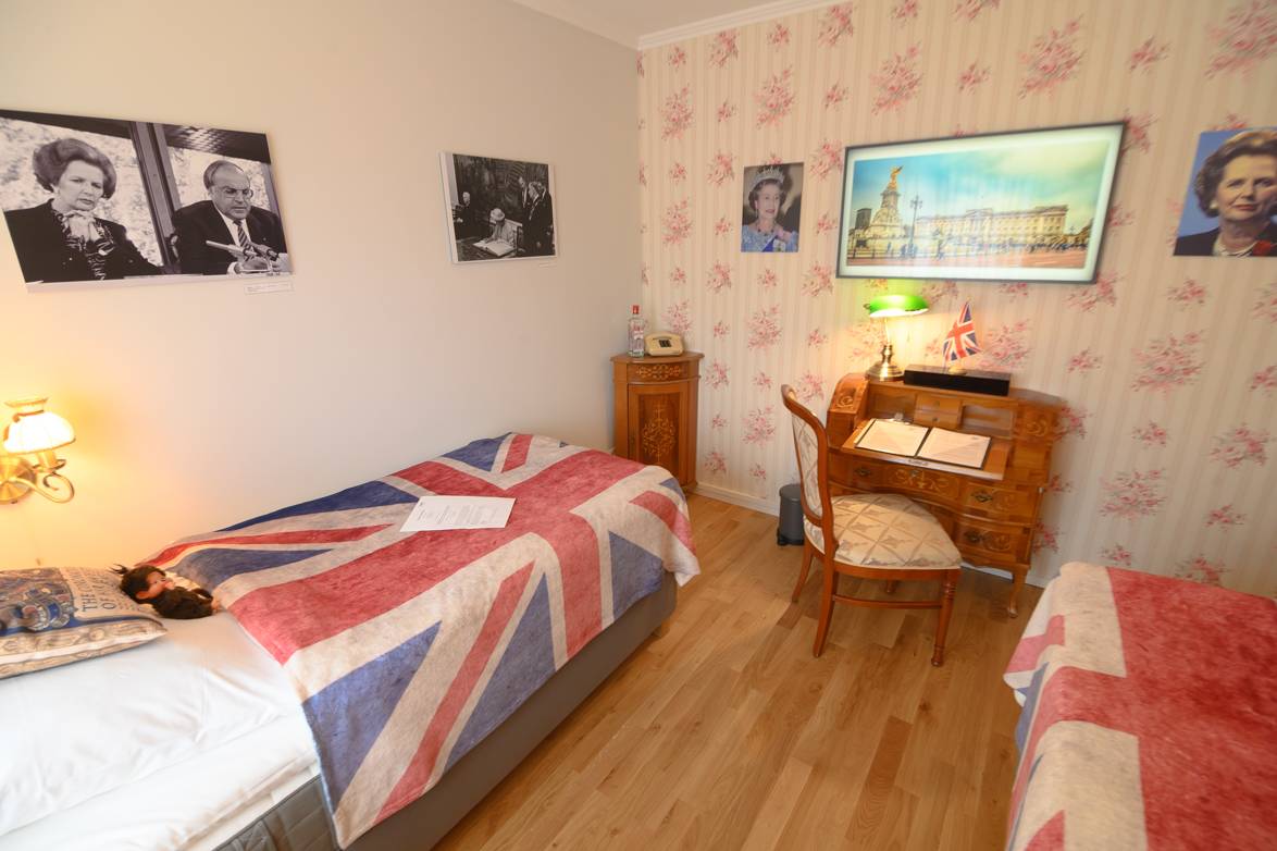 Das Hotel Rheinland gibt es seit den 60er Jahren. Es hat also selbst schon etliche Geschichten zu erzählen. Die neuen Themenzimmer erzählen dagegen die zurückliegende politische Geschichte der Stadt Bonn. Hier wurde die Politik gemacht, hier war die Welt zu Gast in einer der vielen Botschaften und hierhin kamen die großen Politiker wie Kennedy, Gorbatchow, Mitterand, Nixon oder auch die Queen. Zahlreiche Originalbilder an den Zimmerwänden erinnern an diese Staatsbesuche. Dazu ist jedes Themenzimmer individuell eingerichtet. Die Vorhänge, die Tapete, die Lampen, Sessel, Spiegel...man fühlt sich zurückversetzt in alte Zeiten. Dazu steht in jedem Themenzimmer ein Schreibtisch. Dessen Schubläden sollten Gäste unbedingt öffnen. Hier wartet die ein oder andere Überraschung in Form von Magazinen, Büchern oder Alkohol...