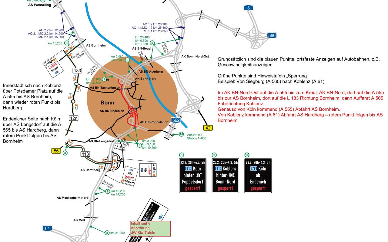 Das großräumige Umleitungskonzept zur Sperrung des betroffenen Teilstückes des A565 sieht von Süden kommend eine Umleitung des Verkehrs in Richtung Köln und Bornheim ab dem Kreuz Meckenheim über die A61 und A553 auf die A555 vor, sowie einen Hinweis auf die Vollsperrung. Die innerörtliche, ausgeschilderte Umleitung führt auf der A565 von Süden kommend ab der Anschlussstelle Bonn-Hardtberg über den Konrad-Adenauer-Damm (L113), die Kreisstraße K12 und die Landesstraße 138n zur Anschlussstelle Bornheim der A555 und in die entgegengesetzte Richtung für den Verkehr, der über die A555 von Norden aus Köln kommt.