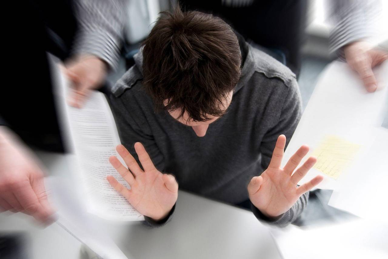 Mann mit hoher Arbeitsbelastung hebt im Büro abwehrend die Hände