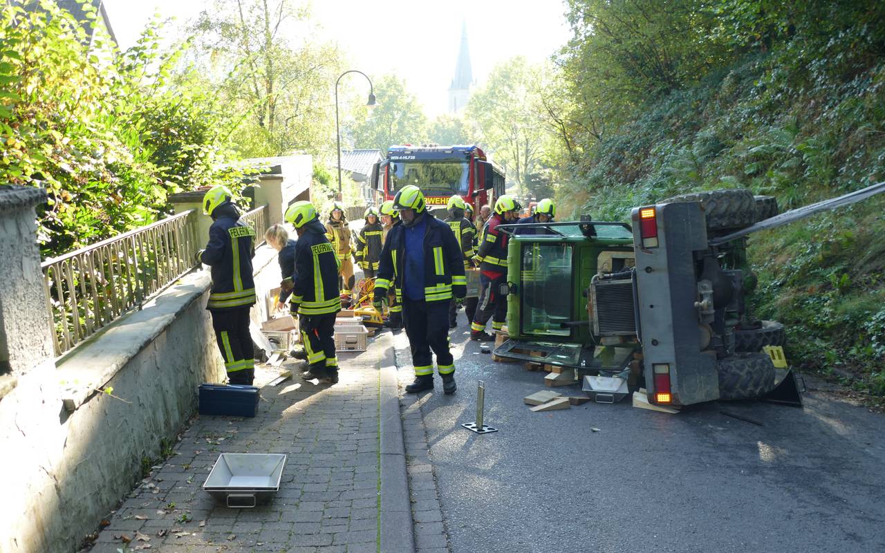 Am Morgen hat es einen schweren Arbeitsunfall in Windeck-Herchen gegeben. Ein Radlader war auf abschüssigem Gelände In der Raubach auf die Seite gekippt.